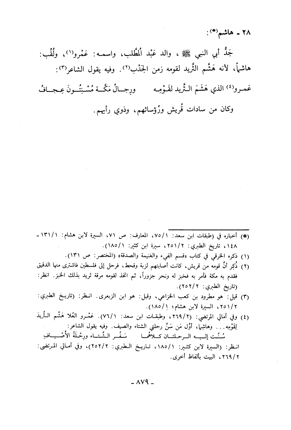 28 - هاشم (*): جَدُّ أبي النبي - صلى الله عليه وسلم -، والد عَبْد المُطَّلب، واسمه: عَمْرو (¬1)، ولُقِّب: هاشمًا، لأنَّه هَشَم الثَّريد لقومه زمن الجَدْب (¬2). وفيه يقول الشاعر (¬3):