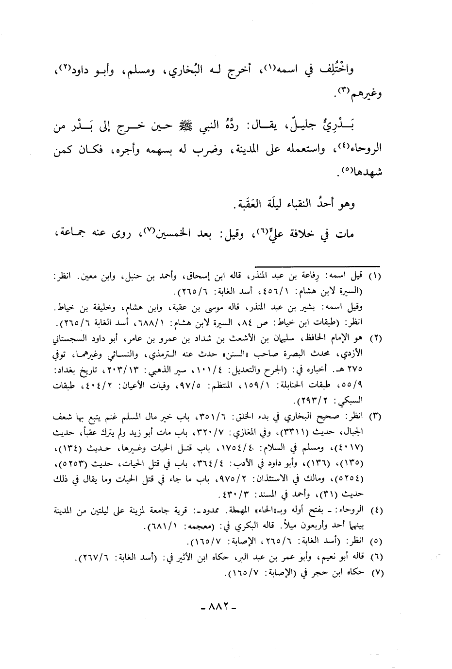 (¬1) قيل اسمه: رِفاعة بن عبد المنذر، قاله ابن إسحاق، وأحمد بن حنبل، وابن معين. انظر: (السيرة لابن هشام: 1/ 456، أسد الغابة: 6/ 265).
