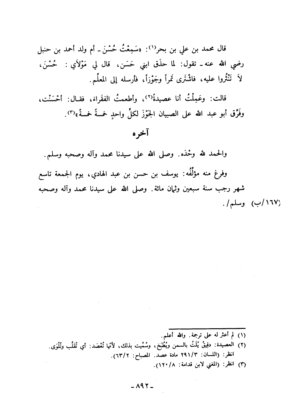 قال محمد بر علي بن بحر (¬1): "سَمِعْتُ حُسْنَ - أم ولد أحمد بن حنبل رضي الله عنه - تقول: لما حذَق ابني حَسَن، قال لي مَوْلَاي: حُسْنَ، لَا تَنْثُروا عليه، فاشْتَرى تَمرًا وجَوْزًا، فأرسله إلى المعلِّم.