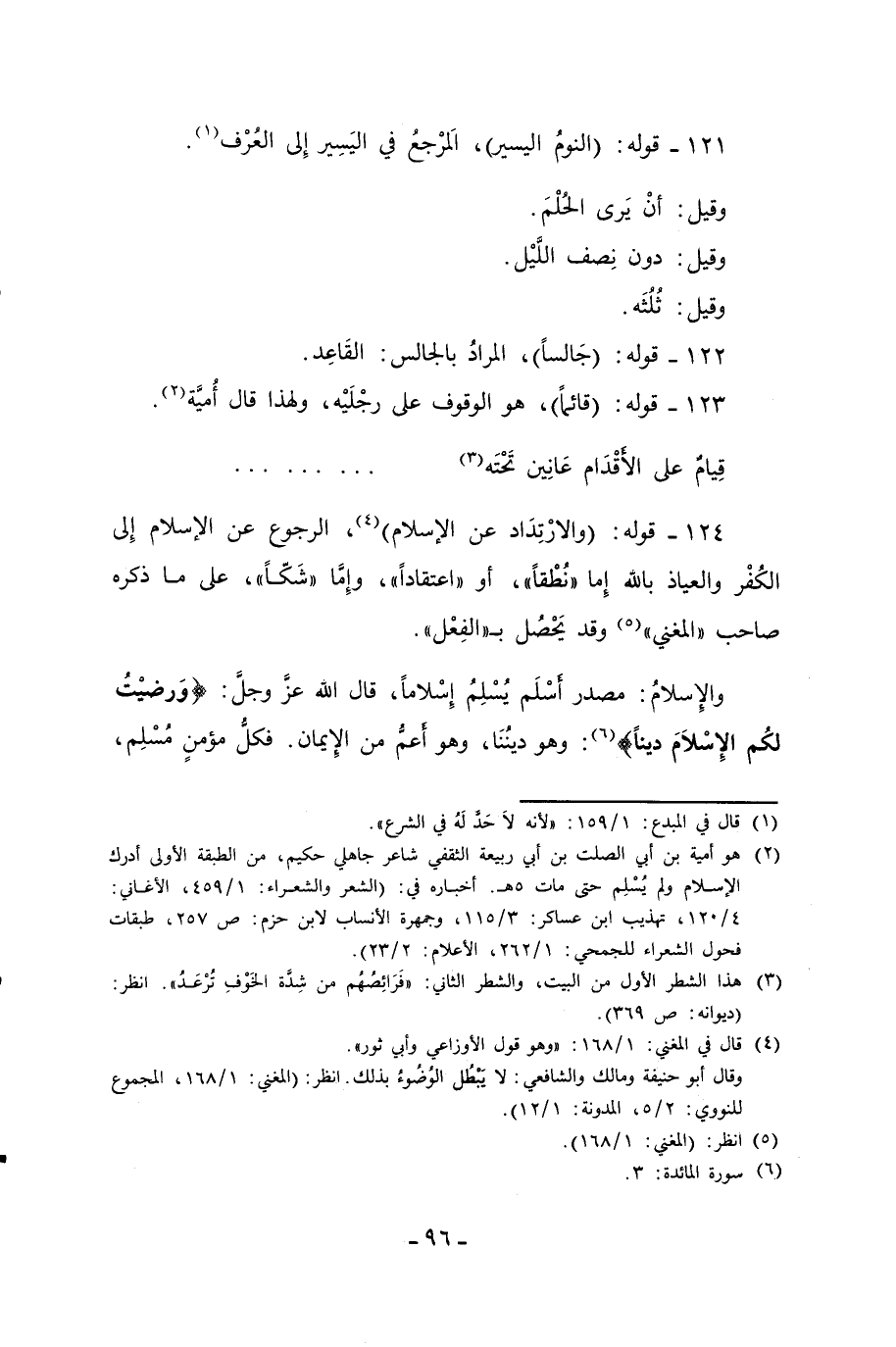 124 - قوله: (والارْتِدَاد عن الإسلام) (¬4)، الرجوع عن الإسلام إِلى الكُفْر والعياذ بالثه إِما "نُطْقًا"، أو "اعتقادًا"، وإِمَّا "شَكًّا"، على ما ذكره صاحب "المغني" (¬5) وقد يَحْصُل بـ "الفِعْل".