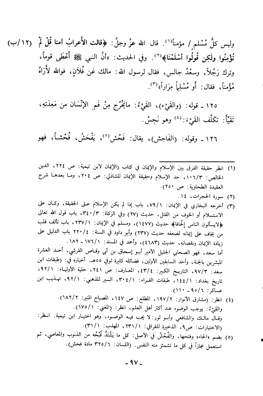 (¬1) انظر حقيقة الفرق بين الإسلام والإيمان في كتاب (الإيمان لابن تيمية: ص 224، الدين الخالص: 3/ 106، حد الإسلام وحقيقة الإيمان للشاذلي: ص 204، وما بعدها شرح العقيدة الطحاوية: ص 250).