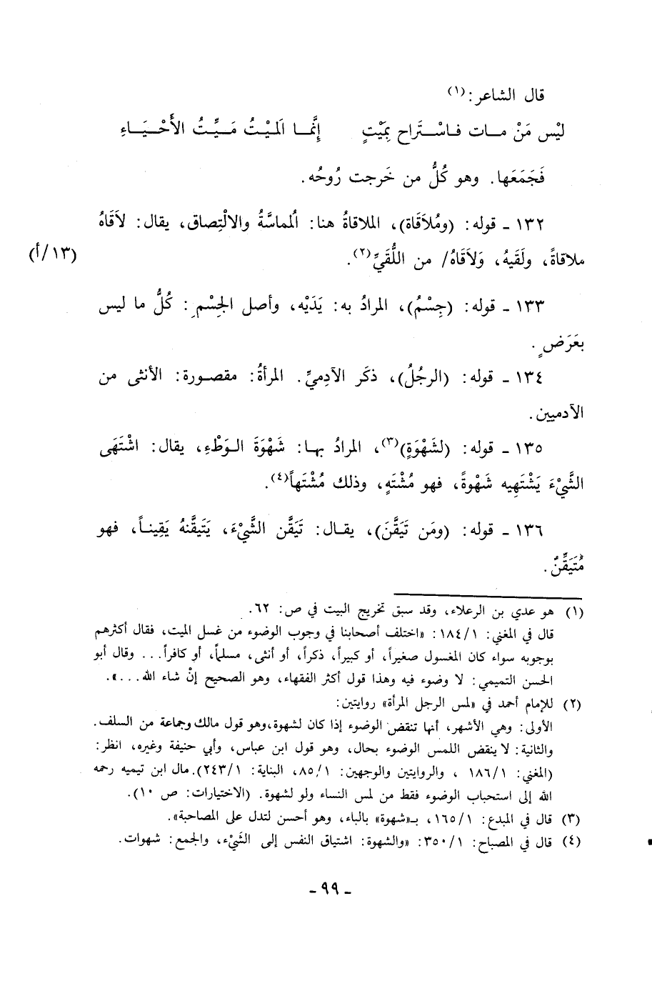 134 - قوله: (الرجُلُ)، ذكَر الآدِميِّ. المرأةُ: مقصورة: الأنثى من الآدميين.