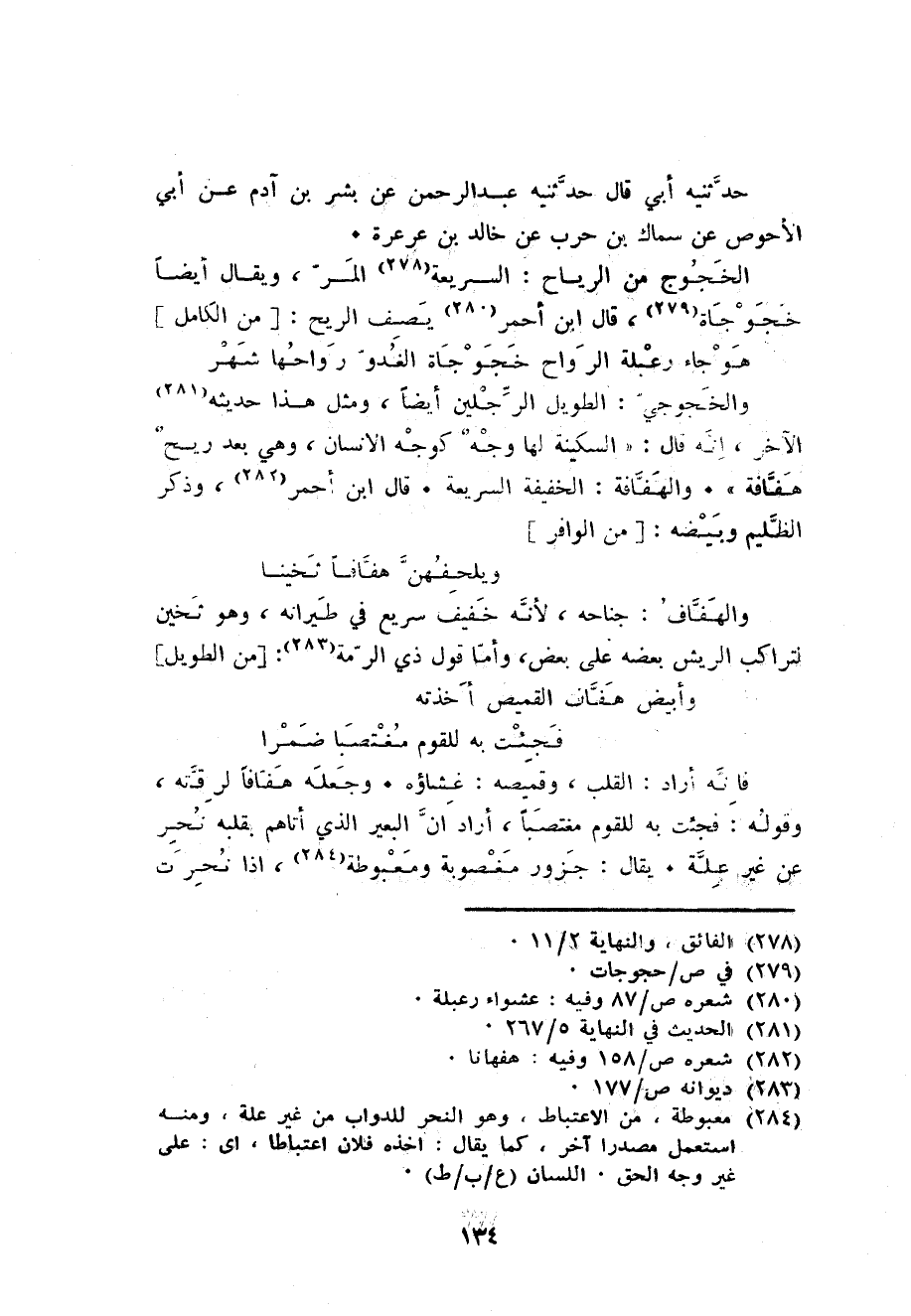 هوجاء رعبلة الرواح خجوجاة الغدو رواحها شهر والخجوجي: الطَّوِيل الرجلَيْن أَيْضا وَمثل هَذَا حَدِيثه الآخر انه قَالَ: السكينَة لَهَا وَجه كوجه الانسان وَهِي بعد ريح هفافة والهفافة: الْخَفِيفَة السريعة. قَالَ ابْن أَحْمَر وَذكر الظليم وبيضه: من الوافر ... ويلحفهن هفافا ثخينا ...