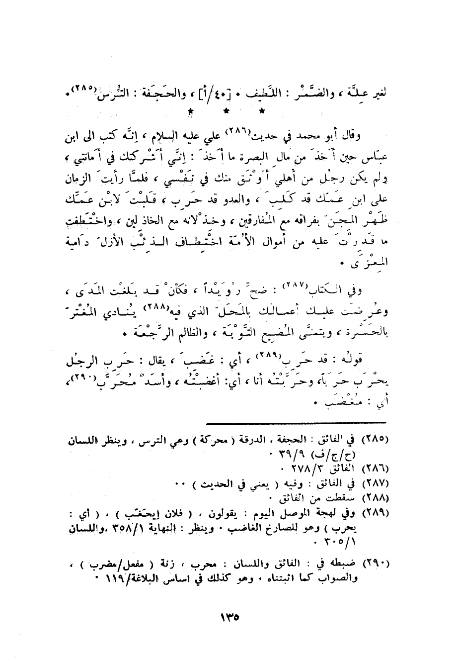 وَقَالَ أَبُو مُحَمَّد فِي حَدِيث عَليّ عَلَيْهِ السَّلَام انه كتب الى ابْن عَبَّاس حِين أَخذ من مَال الْبَصْرَة مَا أَخذ: اني أَشْرَكتك فِي أمانتي وَلم يكن رجل من أَهلِي أوثق مِنْك فِي نَفسِي فَلَمَّا رَأَيْت الزَّمَان على ابْن عمك قد كلب والعدو قد حَرْب قلبت لِابْنِ عمك ظهر الْمِجَن بِفِرَاقِهِ مَعَ المفارقين وخذلانه مَعَ الخاذلين واختطفت مَا قدرت عَلَيْهِ من أَمْوَال الْأمة اختطاف الذِّئْب الْأَزَل دامية المعزى.