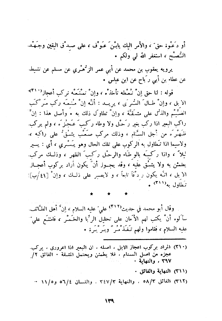 قَوْله: لنا حق ان نعطه نَأْخُذهُ وان نمنعه نركب أعجاز الابل وان طَال السرى يُرِيد: أَنه ان مَنعه ركب مركب الصيم والذل على مشقة وان تطاول ذَلِك بِهِ. وأصل هَذَا: ان رَاكب الْبَعِير اذا ركب بِغَيْر رَحل وَلَا وطاء ركب عَجزه وَلم يركب ظَهره من أجل السنام وَذَلِكَ مركب صَعب يشق على رَاكِبه وَلَا سِيمَا اذا تطاول بِهِ الرّكُوب على تِلْكَ الْحَال وَهُوَ يسري أَي: يسير لَيْلًا واذا رَكبه بالوطاء والرحل ركب الظّهْر وَذَلِكَ مركب يطمئن بِهِ وَلَا يشق عَلَيْهِ وَقد يجوز أَن يكون أَرَادَ بركوب اعجاز الابل انه يكون ردفا تَابعا وَلَا يصبر على ذَلِك وان تطاول بِهِ.