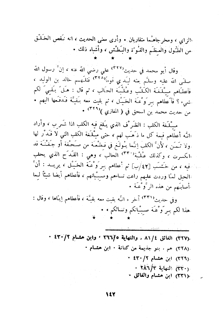 وَقَالَ أَبُو مُحَمَّد فِي حَدِيث عَليّ رَضِي الله عَنهُ ان رَسُول الله صلى الله عَلَيْهِ وَسلم بَعثه ليدي قوما قَتلهمْ خَالِد بن الْوَلِيد فَأَعْطَاهُمْ ميلغة الْكَلْب وعلبة الحالب ثمَّ قَالَ: هَل بَقِي لكم شَيْء فَأَعْطَاهُمْ بروعة الْخَيل ثمَّ بقيت مَعَه بَقِيَّة فَدَفعهَا اليهم. من حَدِيث مُحَمَّد بن اسحق فِي الْمَغَازِي.