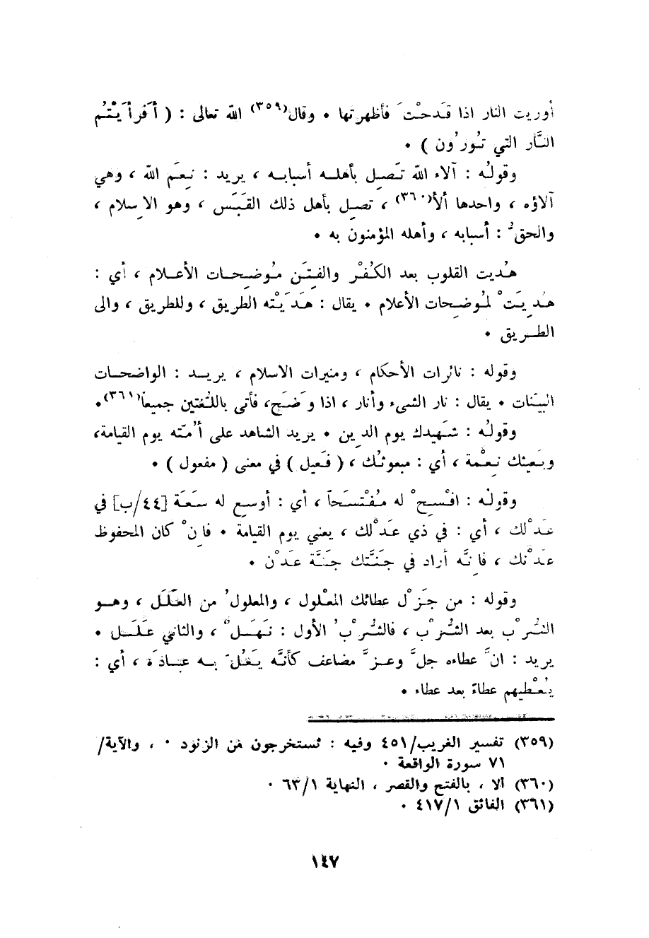 وَقَوله: تائرات الْأَحْكَام ومنيرات الاسلام يُرِيد: الواضحات الْبَينَات. يُقَال: نَار الشىء وأنار اذا وضح فَأتى باللغتين جَمِيعًا.