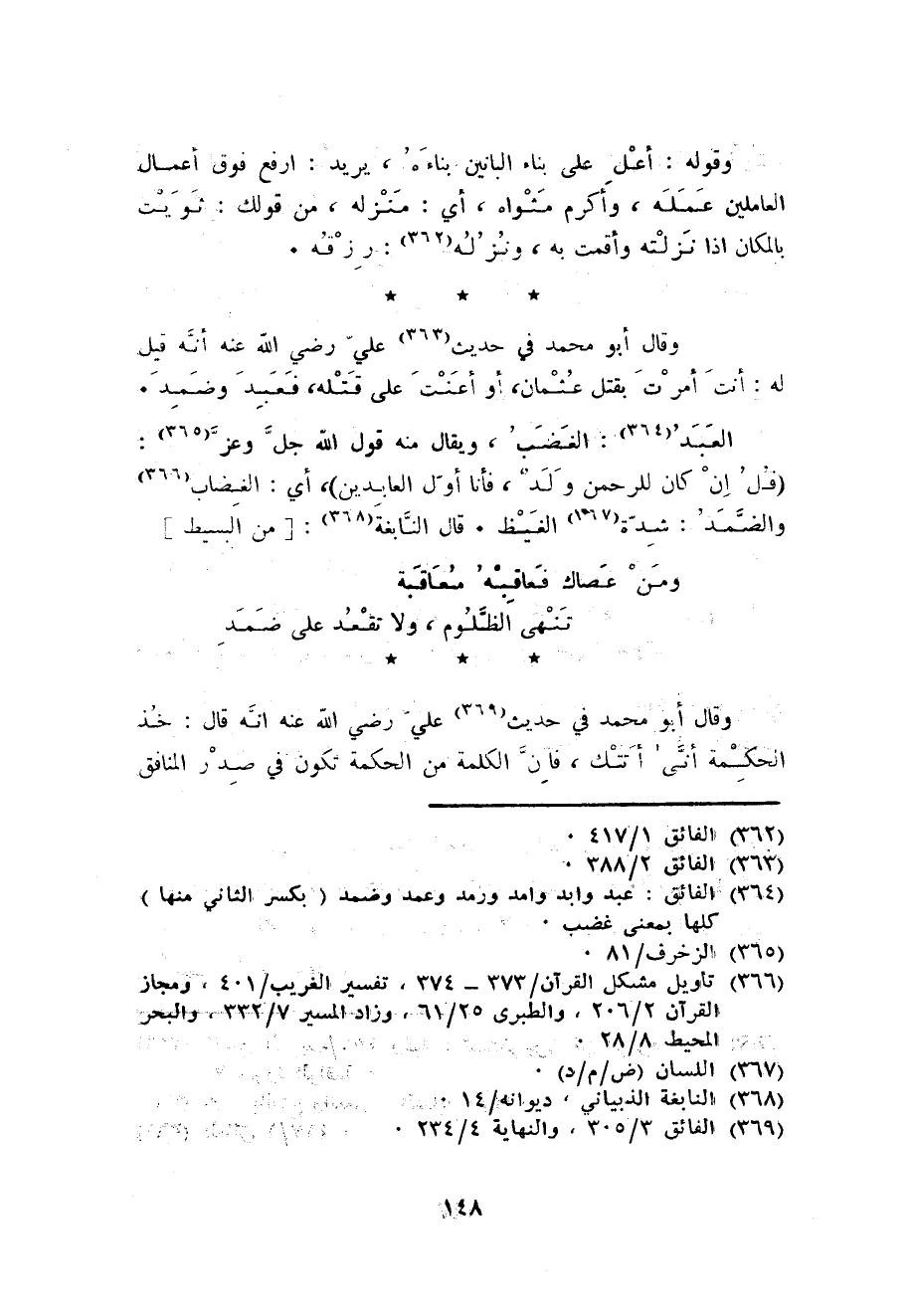 العَبْد: الْغَضَب وَيُقَال مِنْهُ قَول الله جلّ وَعز: {قل إِن كَانَ للرحمن ولد فَأَنا أول العابدين} أَي: الغضاب والضمد: شدَّة الغيظ. قَالَ النَّابِغَة: من الْبَسِيط ... وَمن عصاك فعاقبه معاقبة ... تنْهى الظلوم وَلَا تقعد على ضمد ...