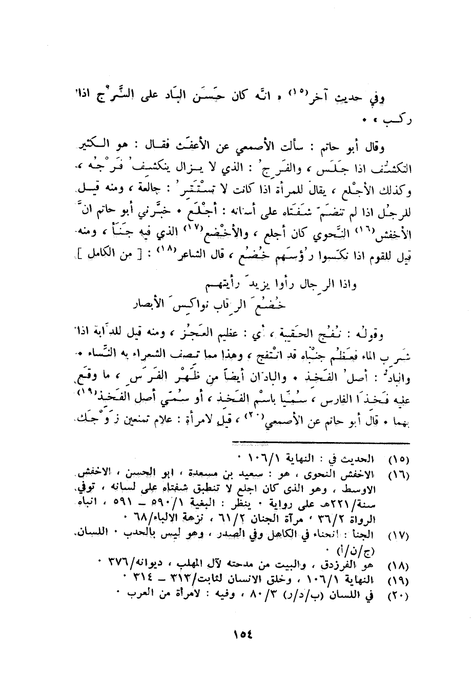 وَقَالَ أَبُو حَاتِم: سَأَلت الْأَصْمَعِي عَن الأعفث فَقَالَ: هُوَ الْكثير التكشف اذا جلس والفرج: الذى لَا يزَال ينْكَشف فرجه وَكَذَلِكَ الأجلع يُقَال للْمَرْأَة اذا كَانَت لَا تستتر: جالعة وَمِنْه قيل للرجل اذا لم تنضم شفتاه على أَسْنَانه: أجلع. خبرني أَبُو حَاتِم ان الْأَخْفَش النَّحْوِيّ كَانَ أجلع والأخضع الَّذِي فِيهِ جنأ وَمِنْه قيل للْقَوْم اذا نكسوا رُؤْسهمْ خضع قَالَ الشَّاعِر: من الْكَامِل ... واذا الرِّجَال رَأَوْا يزِيد رَأَيْتهمْ ... خضع الرّقاب نواكس الْأَبْصَار ...