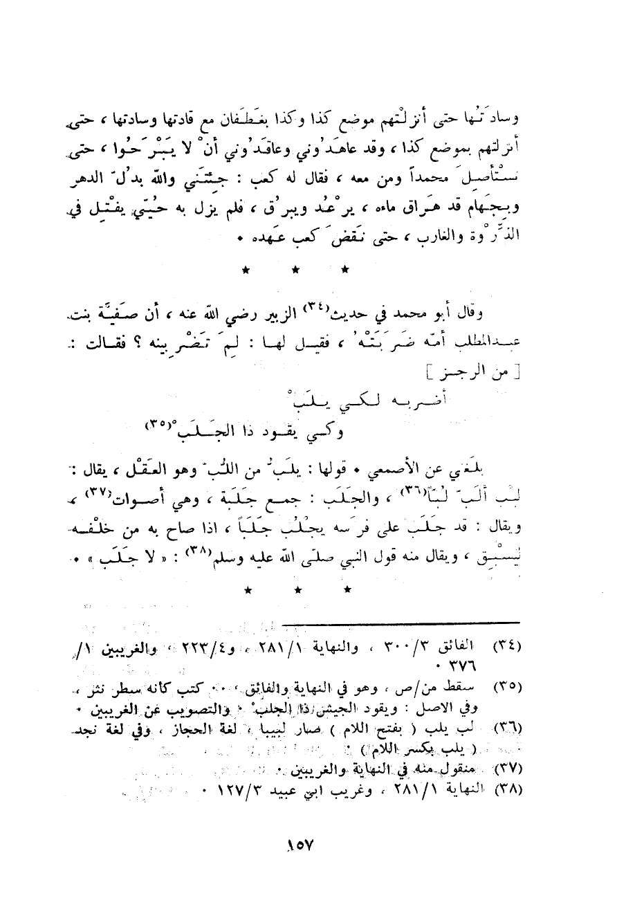 وَقَالَ أَبُو مُحَمَّد فِي حَدِيث الزبير رَضِي الله عَنهُ ان صَفِيَّة بنت عبد المطلب أمة ضَربته فَقيل لَهَا: لم تضربينه فَقَالَت: من الرجز ... أضربه لكَي يلب ... وكي يَقُود ذَا الجلب ...