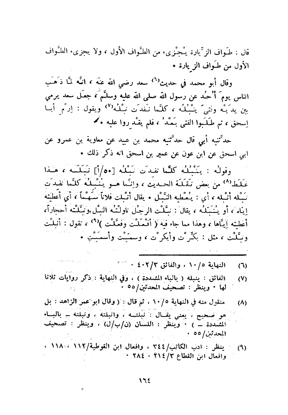 وَقَوله: ينبله كلما نفدت نبله نبله هَذَا غلط من بعض نقلة الحَدِيث وانما هُوَ ينبله كلما نفدت نبله أنبله أَي: يُعْطِيهِ النبل. يُقَال أنبلت فلَانا سَهْما أَي أَعْطيته اياه أَو ينبله يُقَال: نبلت الرجل ناولته النبل ونبلته أحجارا أَعْطيته اياها وَهَذَا مِمَّا جَاءَ فِيهِ افعلت وَفعلت تَقول: أنبلت ونبلت مثل: بكرت وأبكرت وَسميت وأسميت.