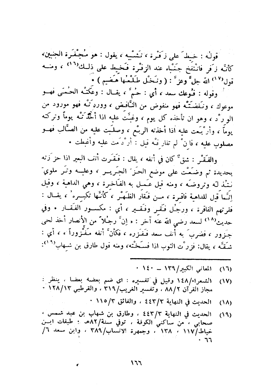 والفقر: شقّ كَانَ فِي أَنفه يُقَال: فقرت أنف الْبَعِير اذا حززته بحديدة ثمَّ وضعت على مَوضِع الحز الْجَرِير وَعَلِيهِ وتر ملوي نتذله وتروضه وَمِنْه قيل عمل بِهِ الفاخرة وَهِي الداهية وَقيل انما قيل للداهية فاقرة من فقار الظّهْر كَأَنَّهَا تكسره يُقَال: فقرتهم الفاقرة وَرجل فقر وفقير أَي: مكسور الفقار. وَفِي حَدِيث لسعد رَضِي الله عَنهُ آخر: ان رجلا من الْأَنْصَار أَخذ لحى جزور فَضرب بِهِ أنف سعد ففزره فَكَأَن أَنفه مفزورا أَي: شقَّه يُقَال: فزرت الثَّوْب اذا فسخته وَمِنْه قَول طَارق بن شهَاب: