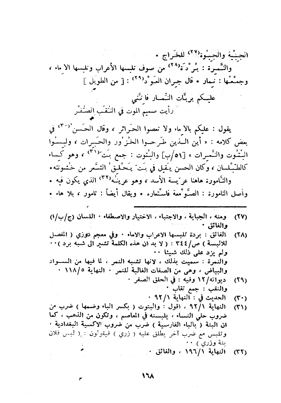 والنمرة: بردة من صوف تلبسها الْأَعْرَاب وتلبسها الاماء وَجَمعهَا: نمار. قَالَ جران الْعود: من الطَّوِيل ... عَلَيْكُم بربات النمار فانني ... رَأَيْت صميم الْمَوْت فِي النقب الصفر ...