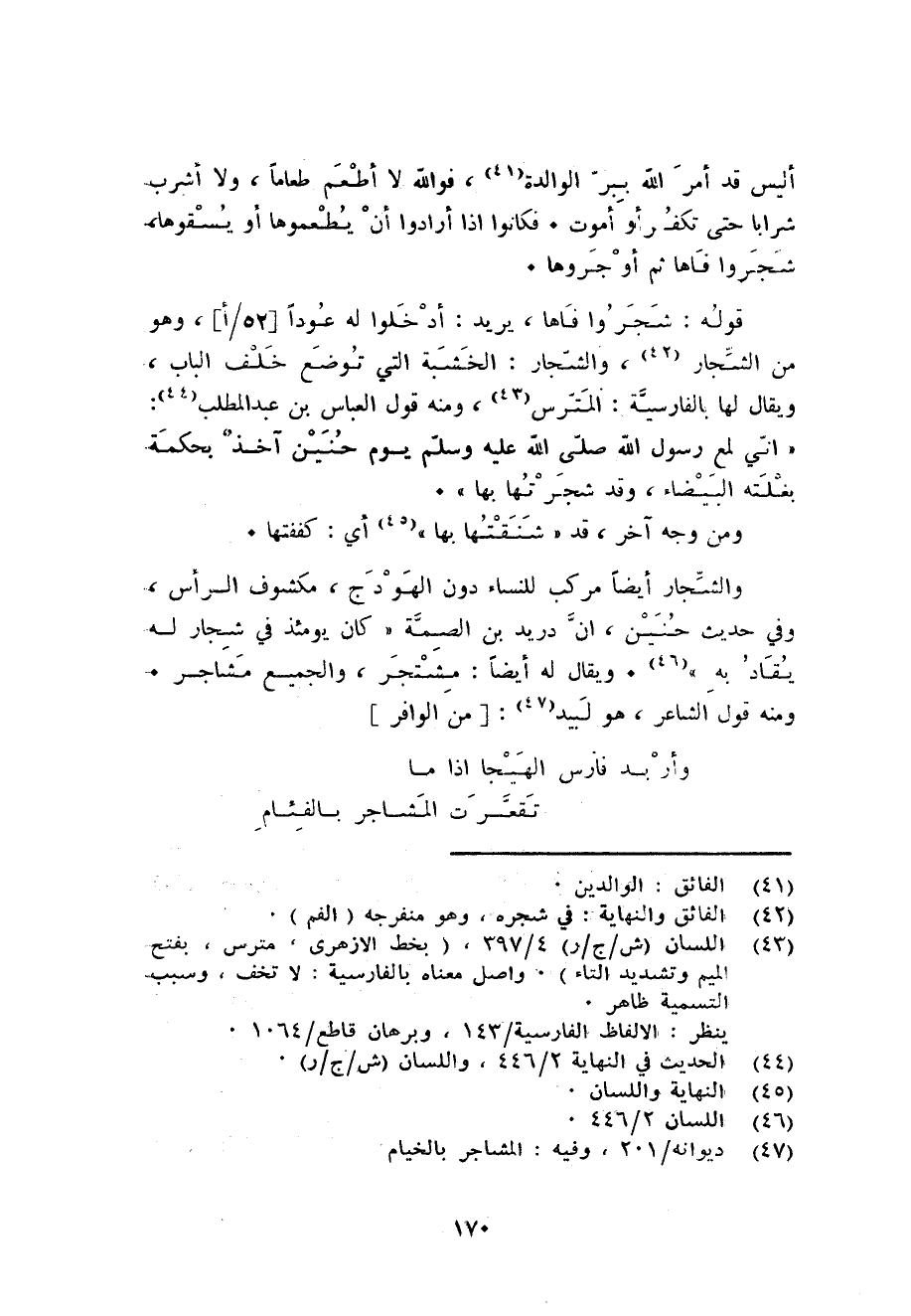 والشجار أَيْضا مركب للنِّسَاء دون الهودج مَكْشُوف الرَّأْس وَفِي حَدِيث حنين ان دُرَيْد بن الصمَّة كَانَ يَوْمئِذٍ فِي شجار لَهُ يُقَاد بِهِ. وَيُقَال لَهُ أَيْضا: مشتجر والجميع مشاجر. وَمِنْه قَول الشَّاعِر هُوَ لبيد: من الوافر ... وأربد فَارس الهيجا اذا مَا ... تقعرت المشاجر بالفئام ...