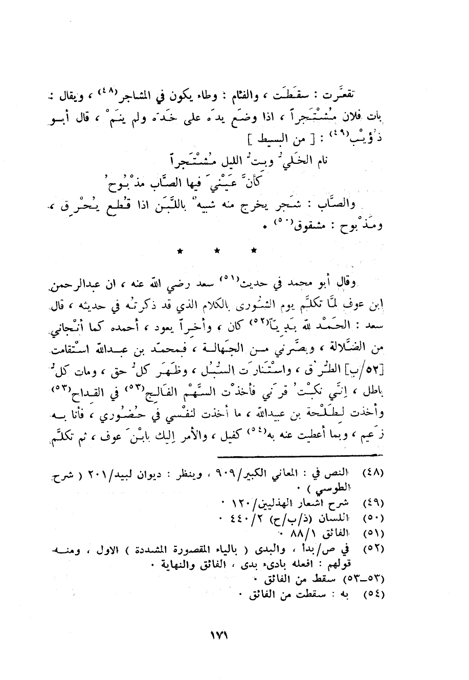 وَقَالَ أَبُو مُحَمَّد فِي حَدِيث سعد رضى الله عَنهُ ان عبد الرَّحْمَن ابْن عَوْف لما تكلم يَوْم الشورى بالْكلَام الَّذِي قد ذكرته فِي حَدِيثه قَالَ سعد: الْحَمد لله بديا كَانَ وأخرا يعود أَحْمَده كَمَا أنجاني من الضَّلَالَة وبصرني من الْجَهَالَة فبمحمد بن عبد الله استقامت الطّرق واستنارت السبل وَظهر كل حق وَمَات كل بَاطِل اني نكبت قَرْني فَأخذت السهْم الفالج فِي القداح وَأخذت لطلْحَة بن عبيد الله مَا أخذت لنَفْسي فِي حضوري فَأَنا بِهِ زعيم وَبِمَا أَعْطَيْت عَنهُ بِهِ كَفِيل وَالْأَمر اليك بِابْن عَوْف ثمَّ تكلم