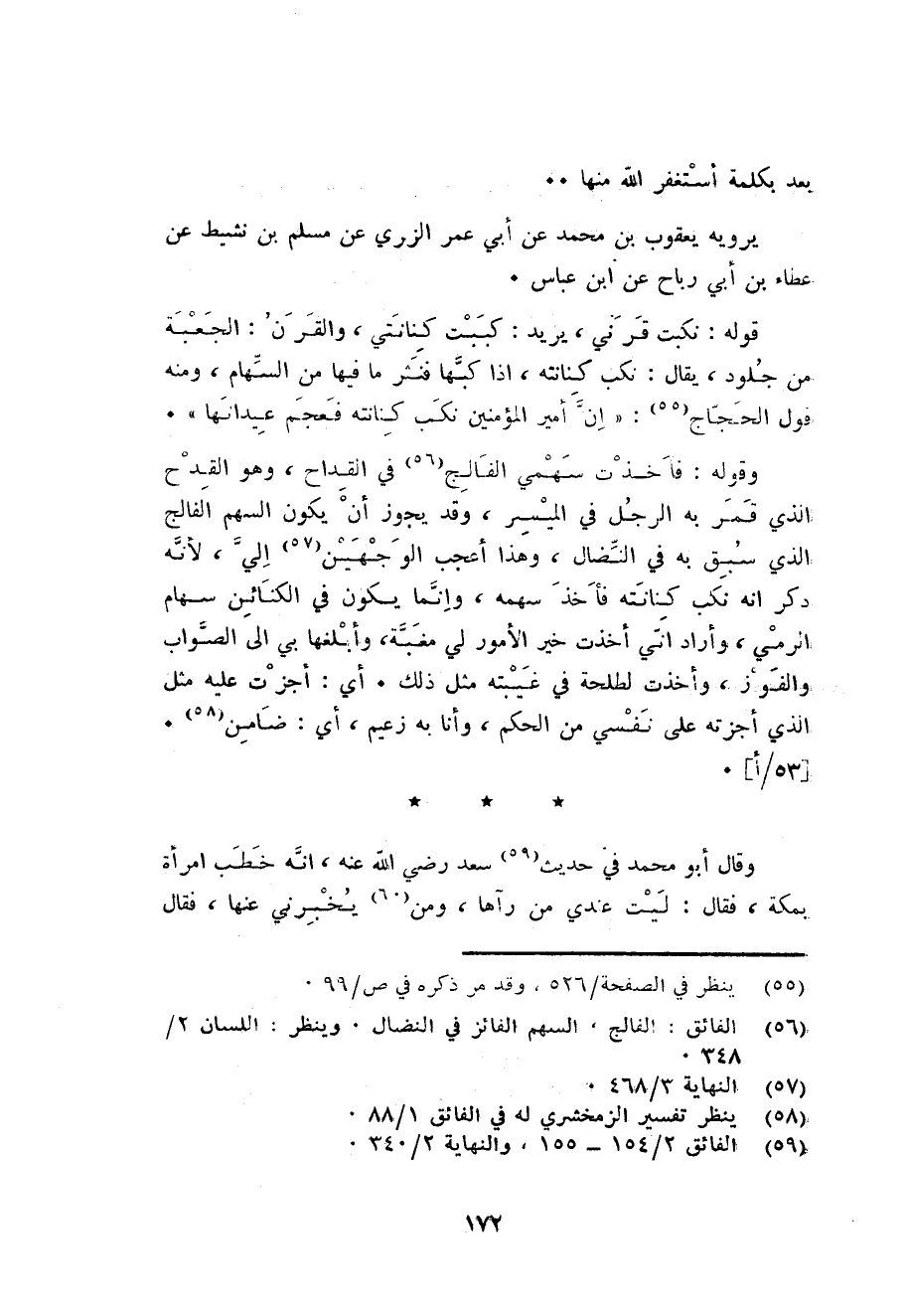 وَقَوله: فآخذت سهمي الفالج فِي القداح وَهُوَ الْقدح الَّذِي قمر بِهِ الرجل فِي الميسر وَقد يجوز أَن يكون السهْم الفالج الَّذِي سبق بِهِ فِي النضال وَهَذَا أعجب الْوَجْهَيْنِ الي لانه ذكر انه نكب كِنَانَته فَأخذ سَهْمه وانما يكون فِي الكنائن سِهَام الرَّمْي وَأَرَادَ اني أخذت خير الْأُمُور لي مغبة وأبلغها بِي الى الصَّوَاب والفوز وَأخذت لطلْحَة فِي غيبته مثل ذَلِك. أَي: أجزت عَلَيْهِ مثل الَّذِي أجزته على نَفسِي من الحكم وَأَنا بِهِ زعيم أَي: ضَامِن.