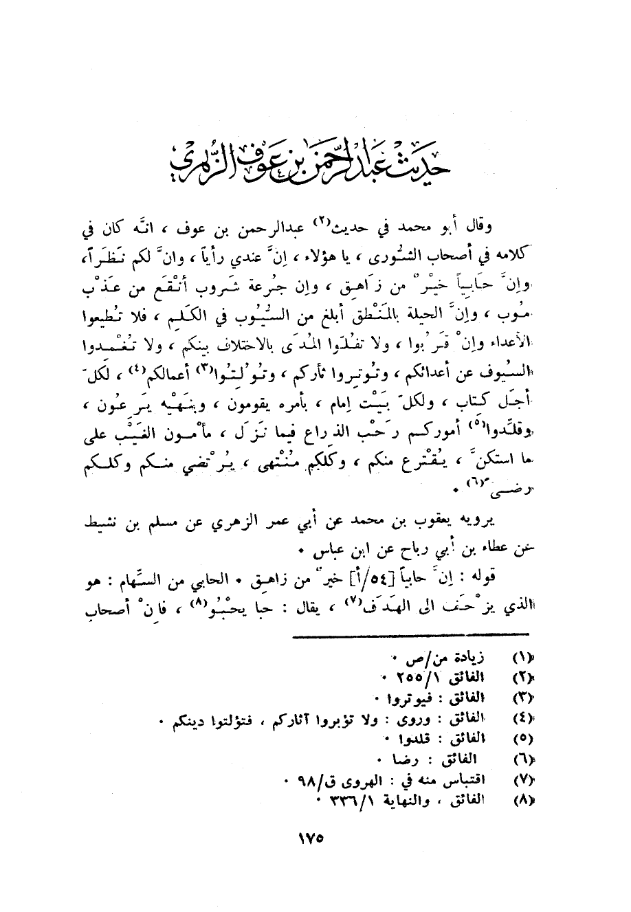 وَقَالَ أَبُو مُحَمَّد فِي حَدِيث عبد الرَّحْمَن بن عون انه كَانَ فِي كَلَامه فِي أَصْحَاب الشورى يَا هَؤُلَاءِ ان عِنْدِي رَأيا وان لكم نظرا وان حابيا خير من زاهق وان جرعة شروب أنقع من عذب موب وان الْحِيلَة بالْمَنْطق أبلغ من السُّيُوب فِي الْكَلم فَلَا تطيعوا الْأَعْدَاء وان قربوا وَلَا تفلوا المدى بالاختلاف بَيْنكُم وَلَا تغمدوا السيوف عَن أعدائكم وتوتروا ثأركم وتولتوا أَعمالكُم لكل أجل كتاب وَلكُل بَيت امام بأَمْره يقومُونَ وبنهيه يرعون وقلدوا أُمُوركُم رحب الذِّرَاع فِيمَا نزل مَأْمُون الْغَيْب على مَا استكن يقترع مِنْكُم وكلكم مُنْتَهى يرتضي مِنْكُم وكلكم رضى.