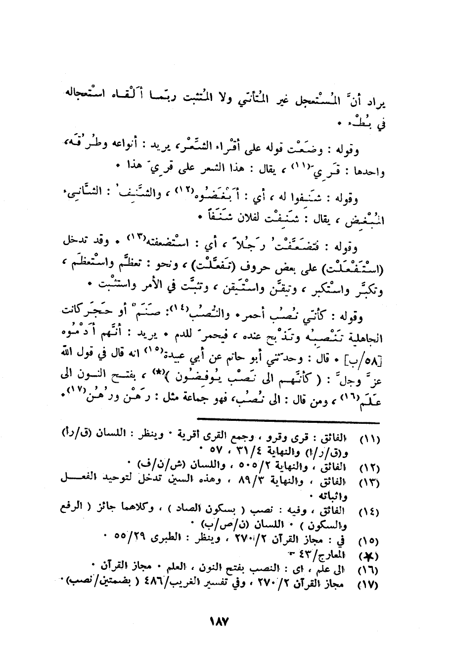 وَقَوله: كَأَنِّي نصب أَحْمَر. وَالنّصب: صنم أَو حجر كَانَت الْجَاهِلِيَّة تنصبه وتذبح عِنْده فيحمر للدم. يُرِيد: أَنهم أدموه. قَالَ: وحَدثني أَبُو حَاتِم عَن أَبى عُبَيْدَة انه قَالَ فِي قَول الله عزوجل: {كَأَنَّهُمْ إِلَى نصب يوفضون} بِفَتْح النُّون الى علم وَمن قَالَ: الى نصب فَهُوَ جمَاعَة مثل: رهن وَرهن.