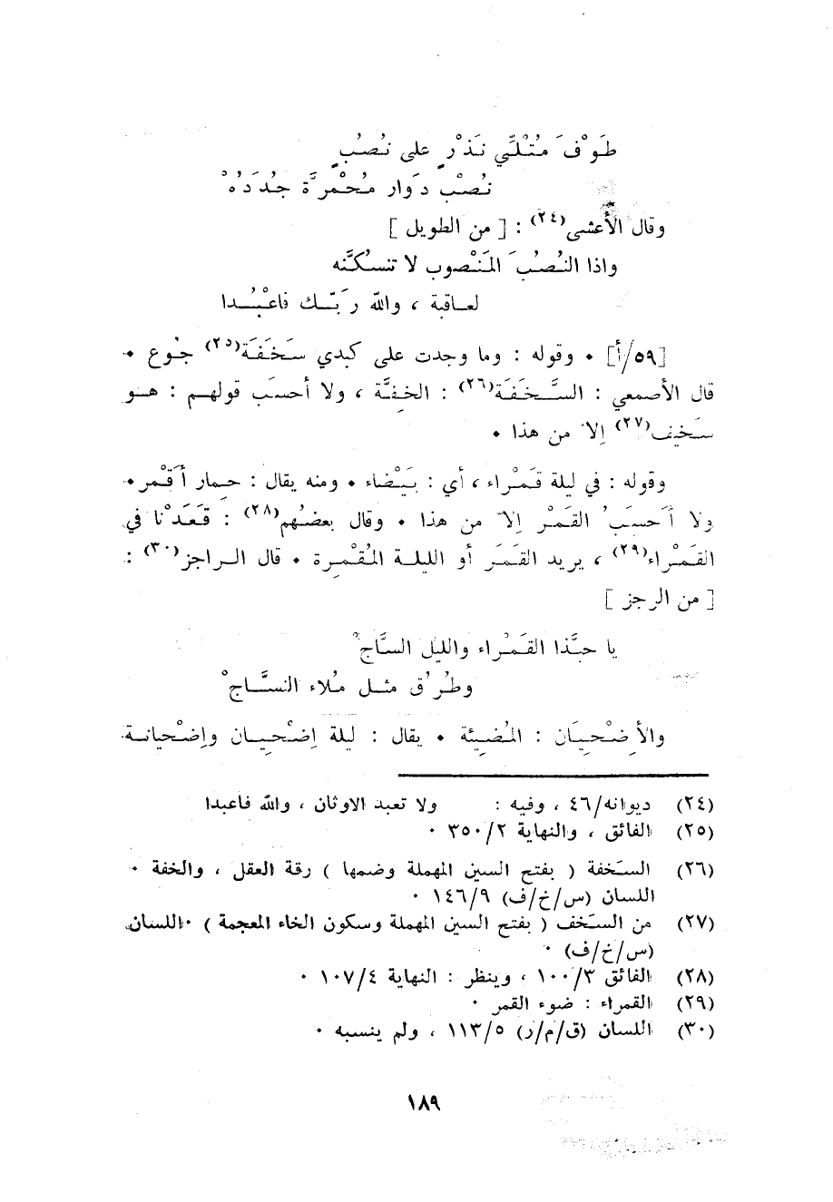 وَقَوله: فِي لَيْلَة قَمْرَاء أَي: بَيْضَاء. وَمِنْه يُقَال: حمَار أقمر. وَلَا أَحسب الْقَمَر الا من هَذَا. وَقَالَ بَعضهم: قعدنا فِي القمراء يُرِيد الْقَمَر أَو اللَّيْلَة المقمرة. قَالَ الراجز: من الرجز ... يَا حبذا القمراء وَاللَّيْل الساج ... وطرق مثل ملاء النساج ...