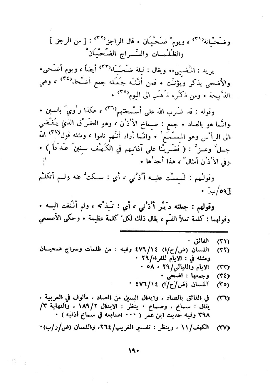 يُرِيد: المضيىء. وَيُقَال: لَيْلَة ضحياء أَيْضا ووسم أضحى والأضحى يذكر وَيُؤَنث. فَمن أنثه جعله جمع أضحاه وَهِي الذَّبِيحَة. وَمن ذكره ذهب الى الْيَوْم.