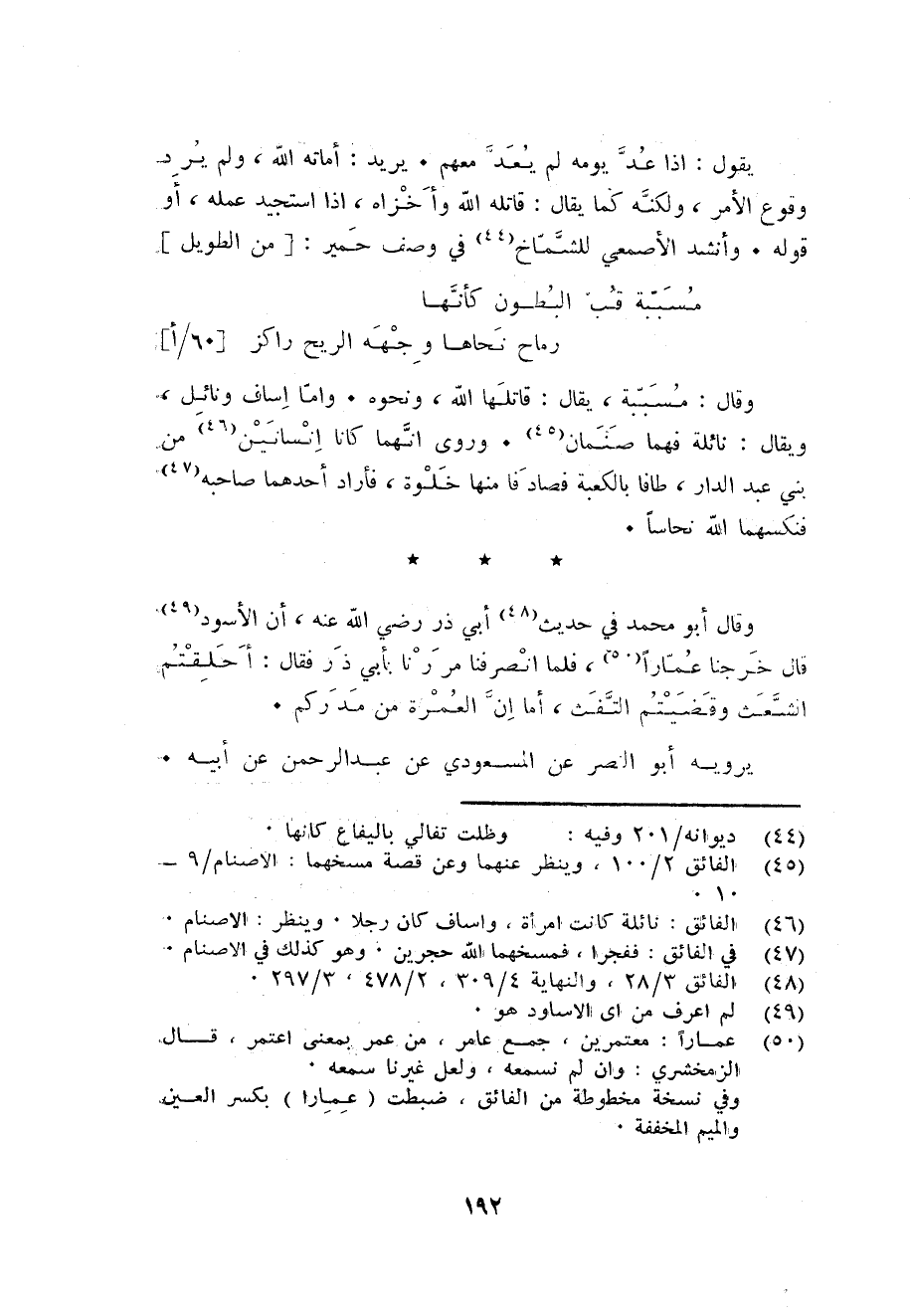 وَقَالَ: مسببة يُقَال: قاتلها الله وَنَحْوه. واما اساف ونائل وَيُقَال: نائلة فهما صنمان. وروى انهما كَانَا انسانين من بني عبد الدَّار طافا بِالْكَعْبَةِ فصادفا مِنْهَا خلْوَة فَأَرَادَ أَحدهمَا صَاحبه فنكسهما الله نُحَاسا.