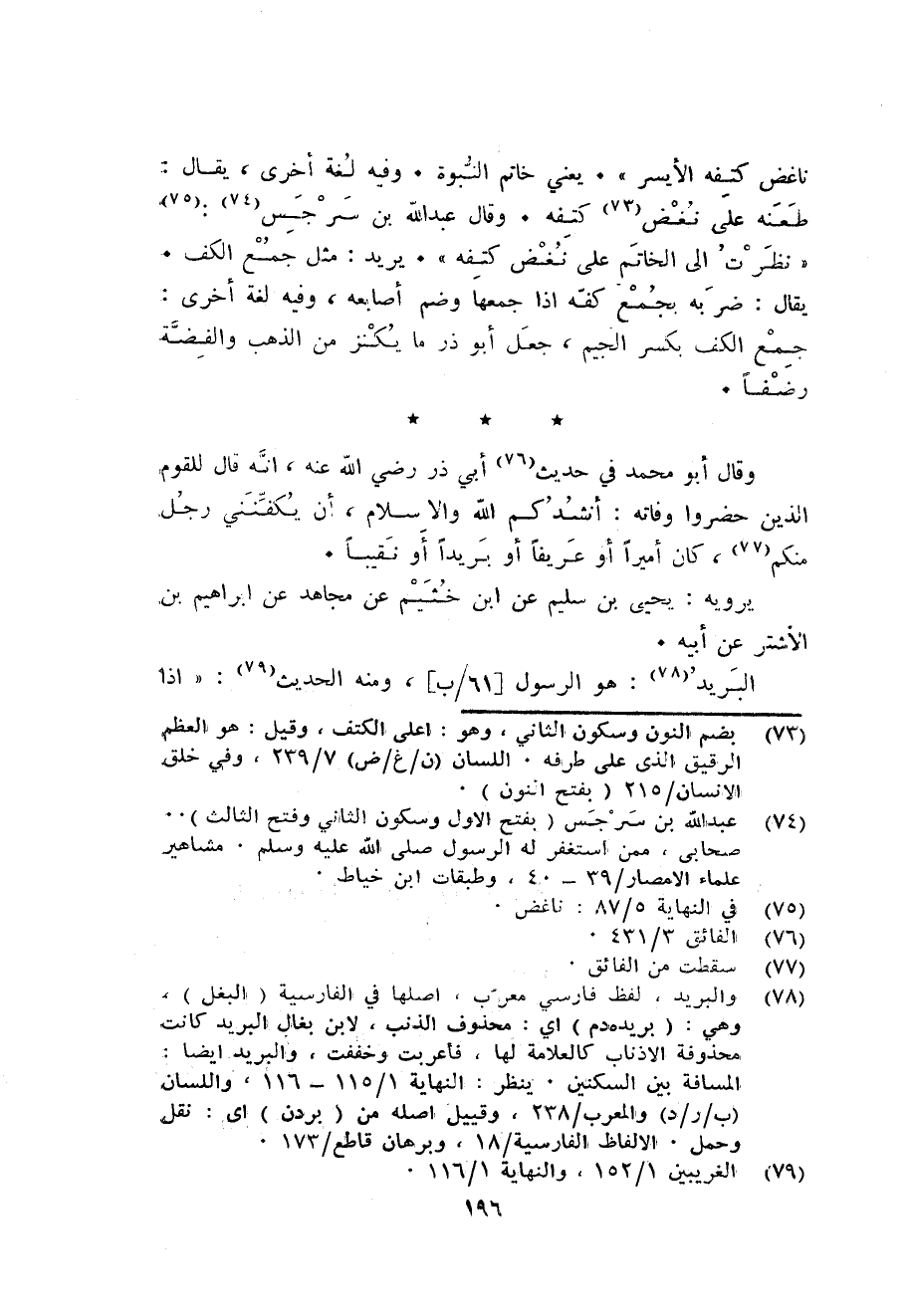 ناغض كتفه الْأَيْسَر. يَعْنِي خَاتم النُّبُوَّة. وَفِيه لُغَة أُخْرَى يُقَال: طعنه على نغض كتفه. وَقَالَ عبد الله بن سرجس: نظرت الى الْخَاتم على نغض كتفه. يُرِيد: مثل جمع الْكَفّ. يُقَال: ضربه بِجمع كَفه اذا جمعهَا وَضم اصابعه وَفِيه لُغَة أُخْرَى: جمع الْكَفّ بِكَسْر الْجِيم جعل أَبُو ذَر مَا يكنز من الذَّهَب وَالْفِضَّة رضفا.