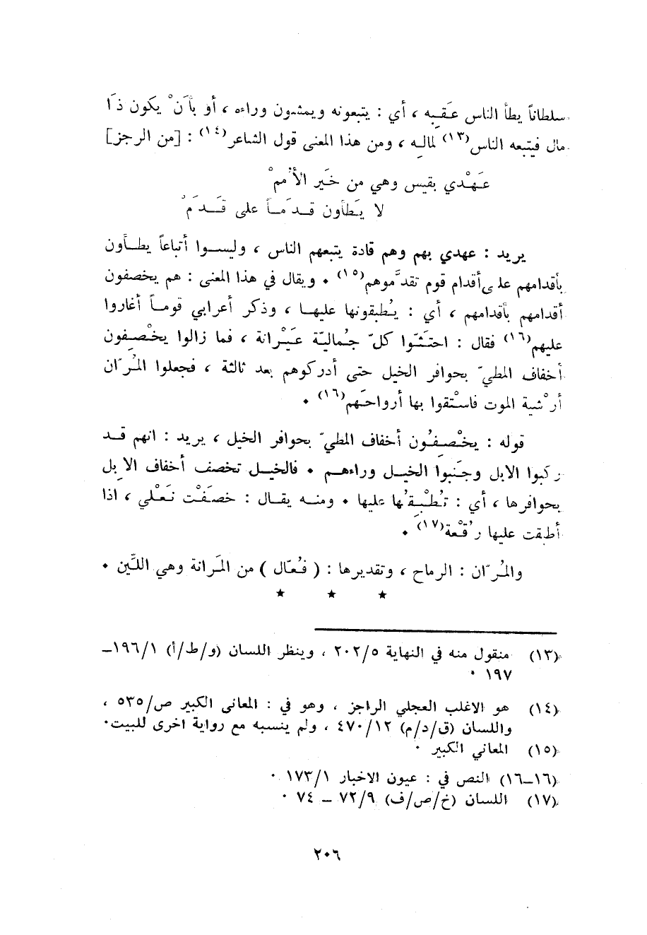 يُرِيد: عهدي بهم وهم قادة يتبعهُم النَّاس وَلَيْسوا أتباعا يطأون بأقدامهم على أَقْدَام قوم تقدموهم. وَيُقَال فِي هَذَا الْمَعْنى: هم يخصفون أَقْدَامهم بأقدامهم أَي: يطبقونها عَلَيْهَا وَذكر أَعْرَابِي قوما أَغَارُوا عَلَيْهِم فَقَالَ: احتثوا كل جمالية عيرانة فَمَا زَالُوا يخصفون أَخْفَاف المطىء بحوافر الْخَيل حَتَّى أَدْركُوهُم بعد ثَالِثَة فَجعلُوا المران أرشية الْمَوْت فاستقوا بهَا أَرْوَاحهم.
