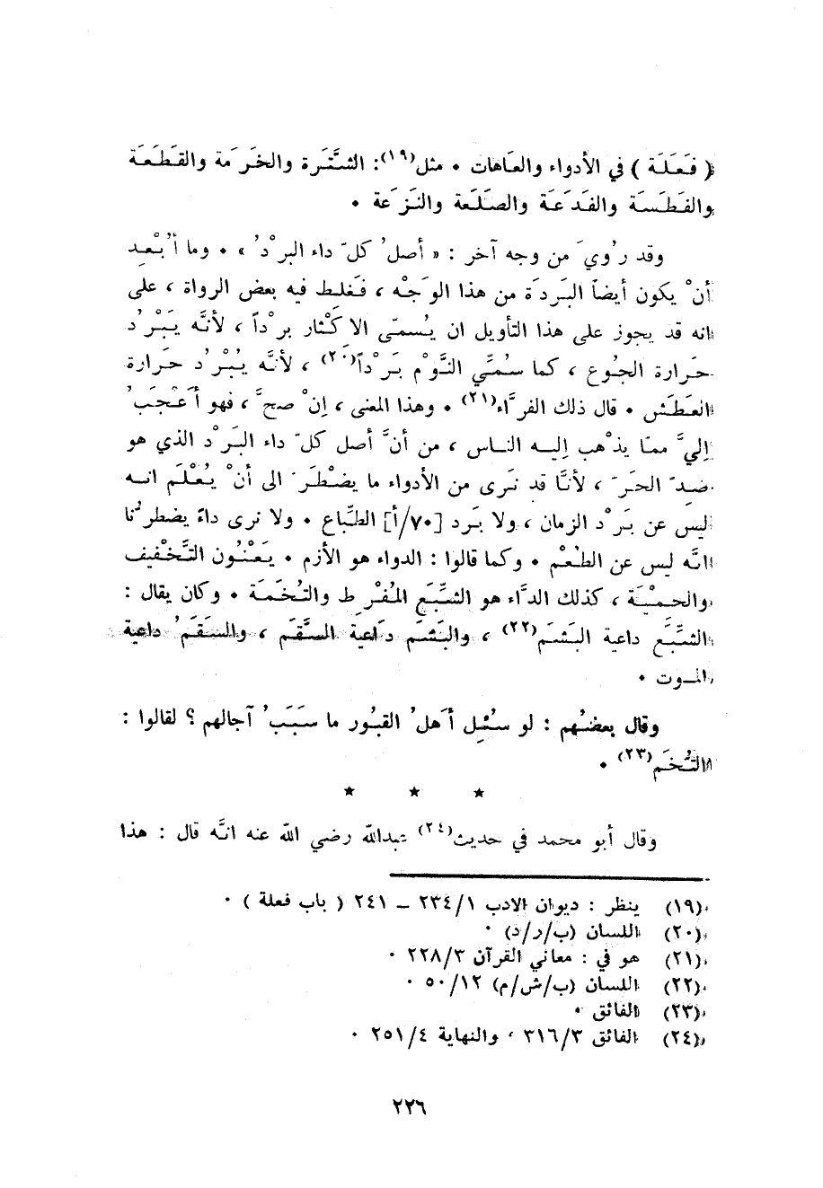 وَقد روى من وَجه آخر: أصل كل دَاء الْبرد. وَمَا أبعد أَن يكون أَيْضا الْبردَة من هَذَا الْوَجْه فغلط فِيهِ بعض الروَاة على انه قد يجوز على هَذَا التَّأْوِيل ان يُسمى الاكثار بردا لِأَنَّهُ يبرد حرارة الْجُوع كَمَا سمي النّوم بردا لِأَنَّهُ يبرد حرارة فالعطش. قَالَ ذَلِك الْفراء. وَهَذَا الْمَعْنى ان صَحَّ فَهُوَ أعجب الي مِمَّا يذهب اليه النَّاس من أَن أصل كل دَاء الْبرد الَّذِي هُوَ ضد الْحر لأَنا قد نرى من الأدواء مَا يضْطَر الى أَن يعلم انه لَيْسَ عَن برد الزَّمَان وَلَا برد الطباع. وَلَا نرى دَاء يضطرنا انه لَيْسَ عَن الطّعْم. وكما قَالُوا: الدَّوَاء هُوَ الأزم. يعنون التَّخْفِيف وَالْحمية كَذَلِك الدَّاء هُوَ الشِّبَع المفرط والتخمة. وَكَانَ يُقَال: الشِّبَع دَاعِيَة البشم والبشم دَاعِيَة السقم والسقم دَاعِيَة الْمَوْت.