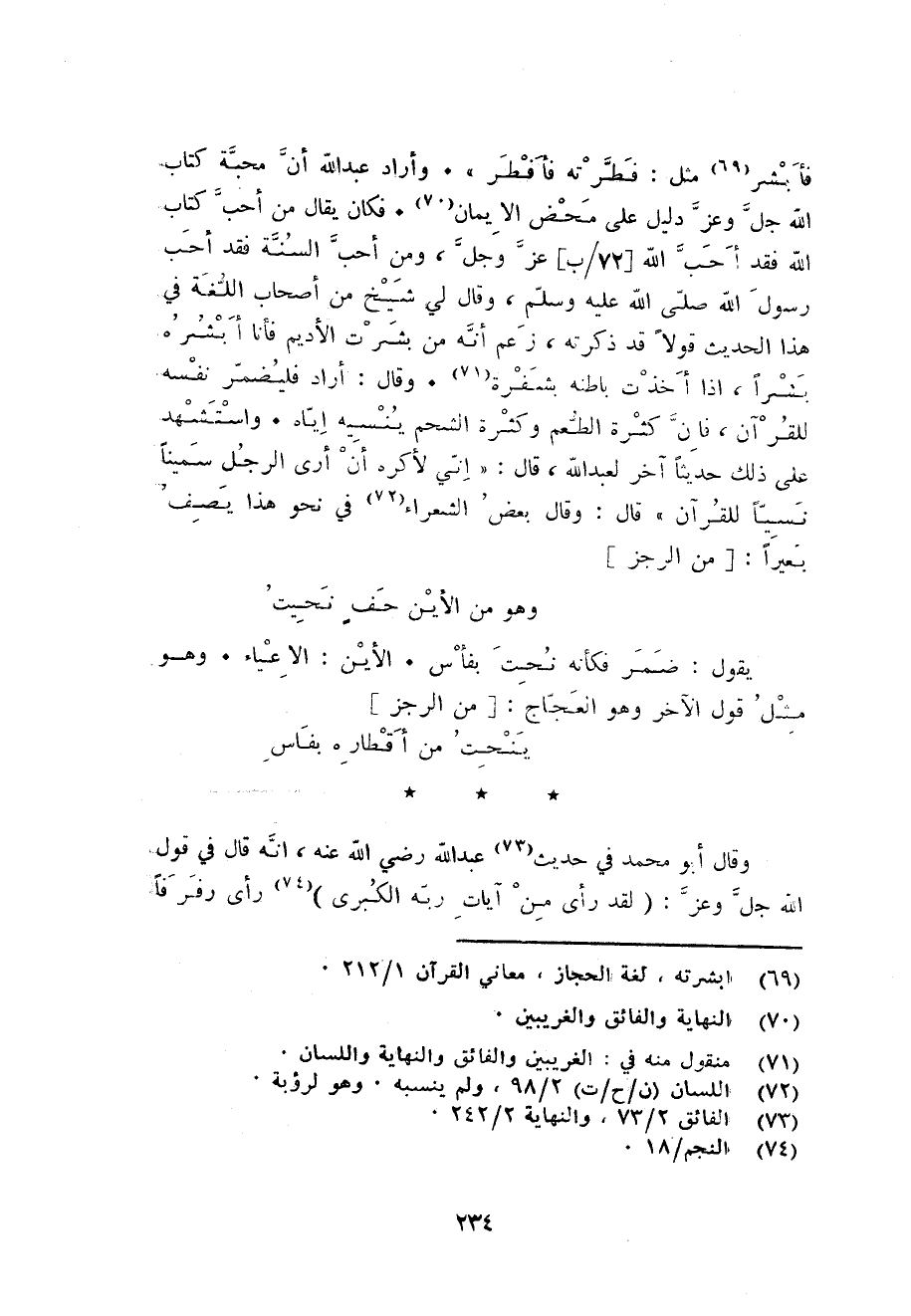 فأبشر مثل: فطرته فَأفْطر. وَأَرَادَ عبد الله أَن محبَّة كتاب الله جلّ وَعز دَلِيل على مَحْض الايمان. فَكَانَ يُقَال من أحب كتاب الله فقد أحب الله جلّ وَعز وَمن أحب السّنة فقد أحب رَسُول الله صلى الله عَلَيْهِ وَسلم وَقَالَ لي شيخ من أَصْحَاب اللُّغَة فِي هَذَا الحَدِيث قولا قد ذكرته زعم أَنه من بشرت الْأَدِيم فَأَنا أُبَشِّرهُ بشرا اذا أخذت بَاطِنه بشفرة. وَقَالَ: أَرَادَ فليضمر نَفسه لِلْقُرْآنِ فان كَثْرَة الطّعْم وَكَثْرَة الشَّحْم ينسيه اياه. وَاسْتشْهدَ على ذَلِك حَدِيثا آخر لعبد الله قَالَ: اني لأكْره أَن أرى الرجل سمينا نسيا لِلْقُرْآنِ قَالَ: وَقَالَ بعض الشُّعَرَاء فِي نَحْو هَذَا يصف بَعِيرًا: من الرجز ... وَهُوَ من الأين حف نحيت ...