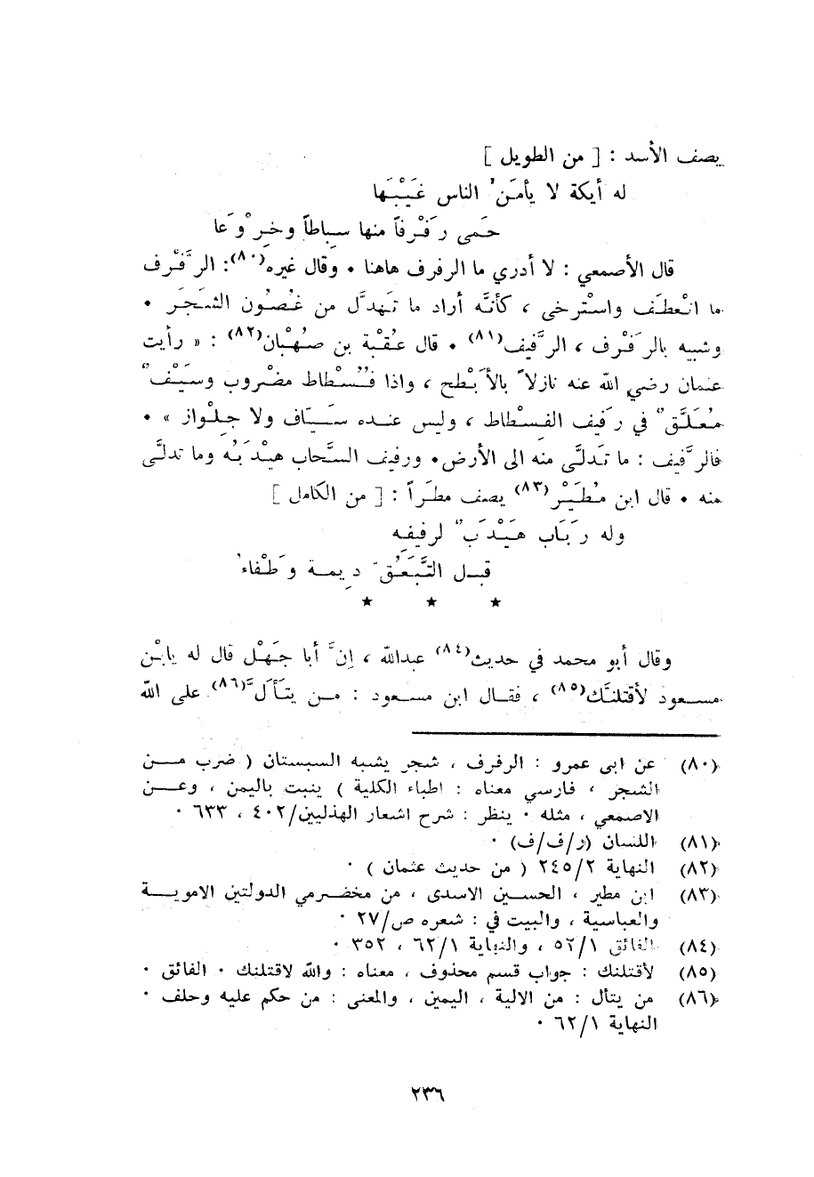 يصف الْأسد: من الطَّوِيل ... لَهُ أيكة لَا يَأْمَن النَّاس غيبها ... حمى رفرفا مِنْهَا سباطا وخروعا ...