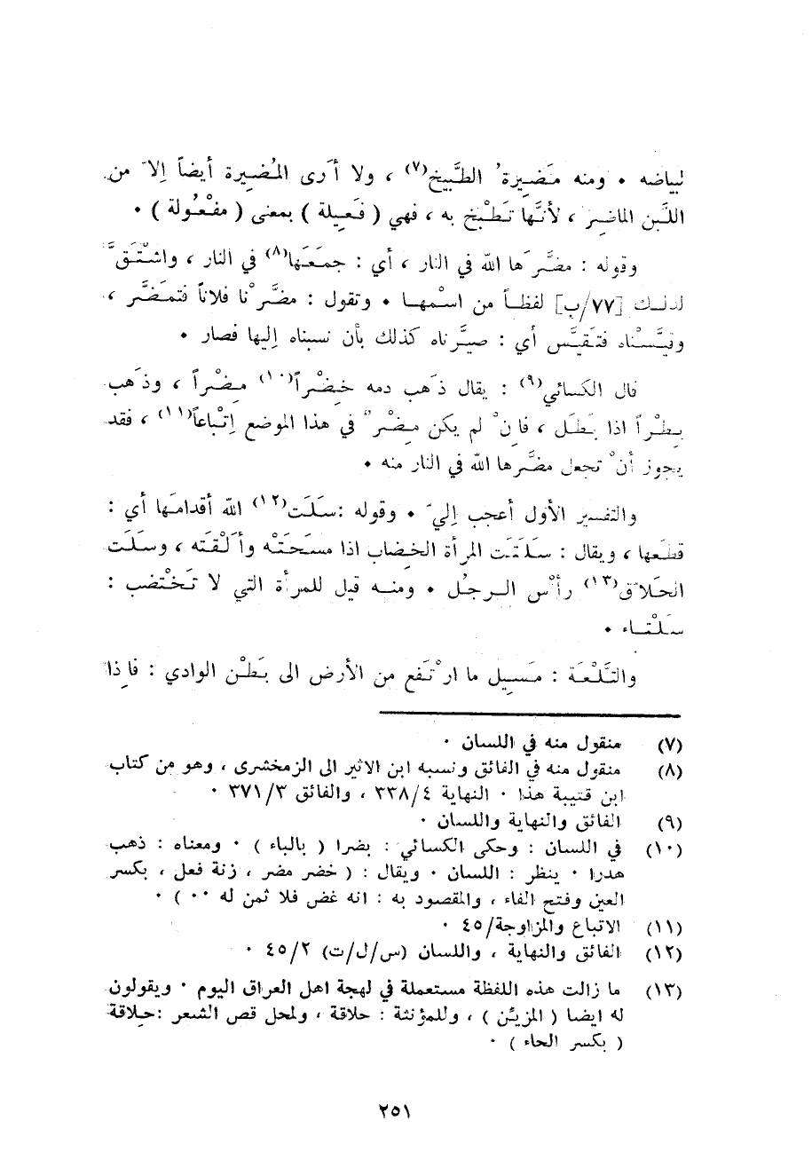 لبياضه. وَمِنْه مضيرة الطبيخ وَلَا أرى المضيرة أَيْضا الا من اللَّبن الماضر لِأَنَّهَا تطبخ بِهِ فَهِيَ فعيلة بِمَعْنى مفعولة. وَقَوله: مضرها الله فِي النَّار أَي: جمعهَا فِي النَّار واشتق لذَلِك لفظا من اسْمهَا. وَتقول: مضرنا فلَانا فتمضر وقيسناه فتقيس أَي: صيرناه كَذَلِك بِأَن نسبناه إِلَيْهَا فَصَارَ.
