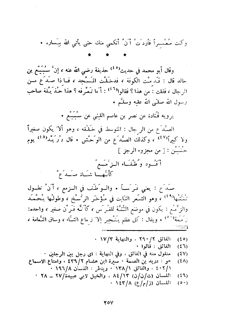 صدع: يَعْنِي فرسا. والوطف فِي الزمع أَن تطول ثنتها وَهُوَ الشّعْر النَّابِت فِي مُؤخر الرسخ وطولها يحمد والزمع: يكون فِي مَوضِع الثنة للْفرس كَأَنَّهُ قرن صَغِير واحده: زَمعَة. وَيُقَال: كل عظم ينجبر الا زماع الشَّاء وسَاق النعامة