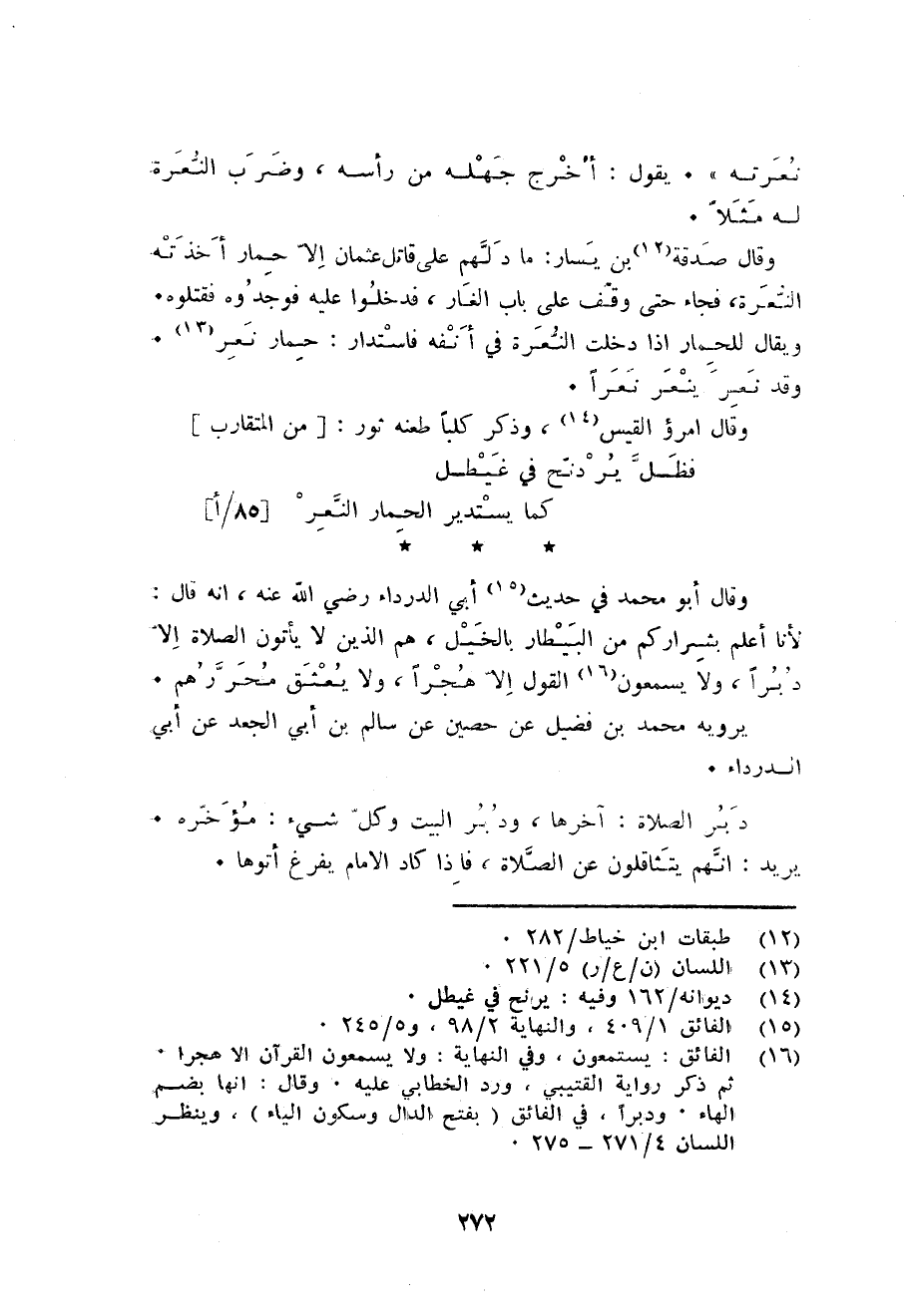 وَقَالَ صَدَقَة بن يسَار: مَا دلهم على قَاتل عُثْمَان الا حمَار أَخَذته النعرة فجَاء حَتَّى وقف على بَاب الْغَار فَدَخَلُوا عَلَيْهِ فوجدوه فَقَتَلُوهُ. وَيُقَال للحمار اذا دخلت النعرة فِي انفه فَاسْتَدَارَ: حمَار نعر. وَقد نعر ينعر نعرا.