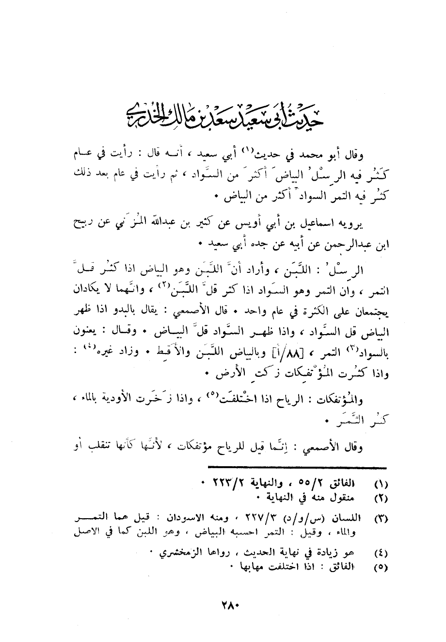 وَقَالَ أَبُو مُحَمَّد فِي حَدِيث أبي سعيد أَنه قَالَ: رَأَيْت فِي عَام كثر فِيهِ الرُّسُل الْبيَاض أَكثر من السوَاد ثمَّ رَأَيْت فِي عَام بعد ذَلِك كثر فِيهِ التَّمْر السوَاد أَكثر من الْبيَاض.