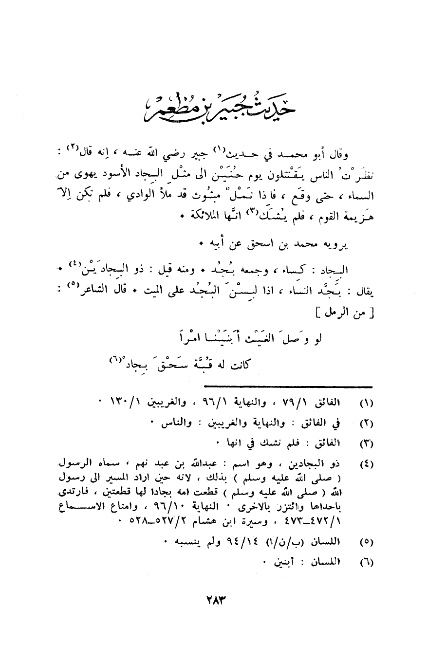 وَقَالَ أَبُو مُحَمَّد فِي حَدِيث جبر رَضِي الله عَنهُ انه قَالَ: نظرت النَّاس يقتتلون يَوْم حنين الى مثل البجاد الاسود يهوى من السَّمَاء حَتَّى وَقع فاذا نمل مبثوث قد مَلأ الْوَادي فَلم تكن الا هزيمَة الْقَوْم فَلم يشك انها الْمَلَائِكَة.