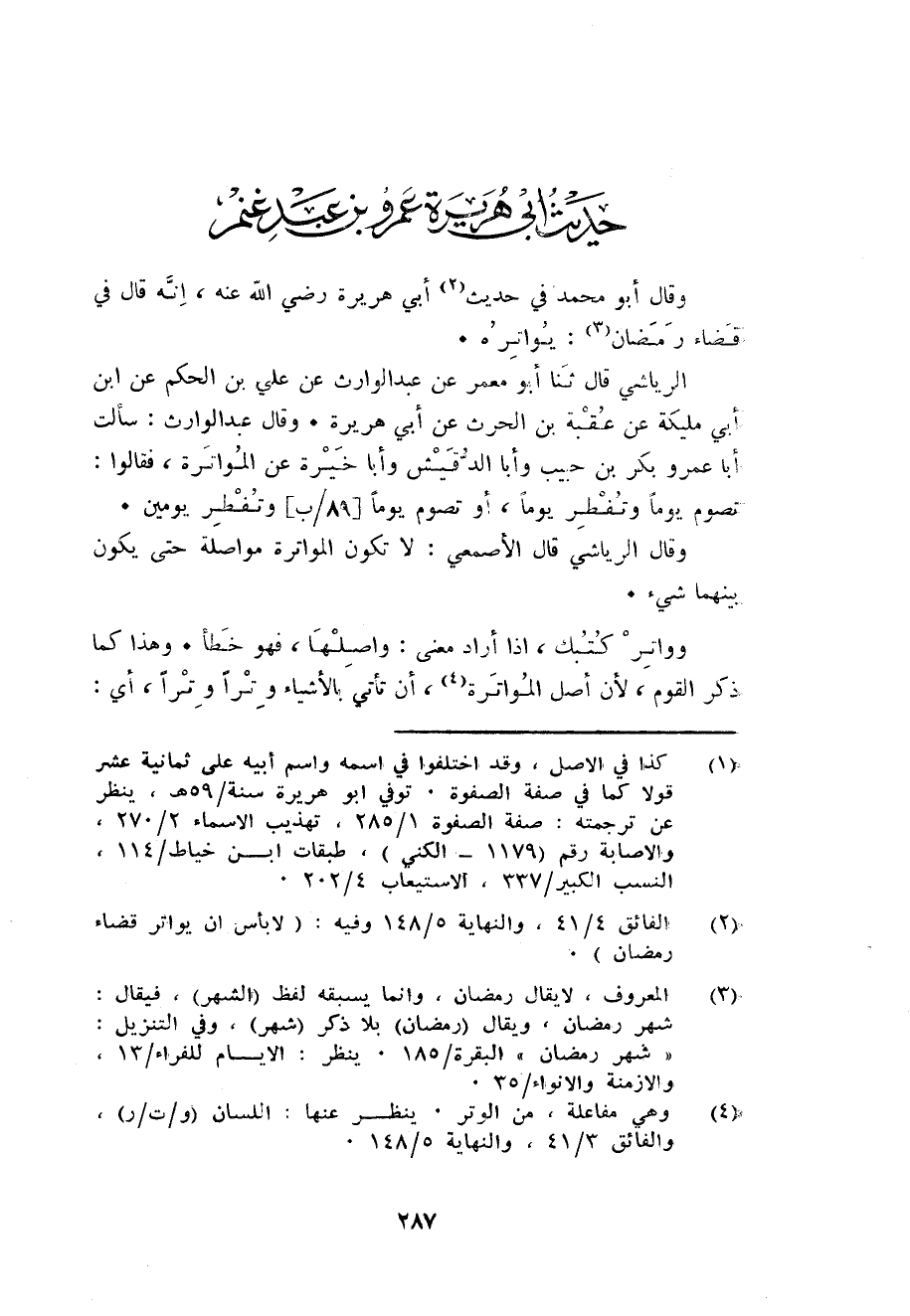 الرياشي قَالَ ثَنَا أَبُو معمر عَن عبد الوارث عَن عَليّ بن الحكم عَن ابْن أبي مليكَة عَن عقبَة بن الْحَرْث عَن أبي هُرَيْرَة. وَقَالَ عبد الْوَارِث: سَأَلت أَبَا عَمْرو بكر بن حبيب وَأَبا الدقيش وَأَبا خيرة عَن المواترة فَقَالُوا: تَصُوم يَوْمًا وتفطر يَوْمًا اَوْ تَصُوم يَوْمًا وتفطر يَوْمَيْنِ.
