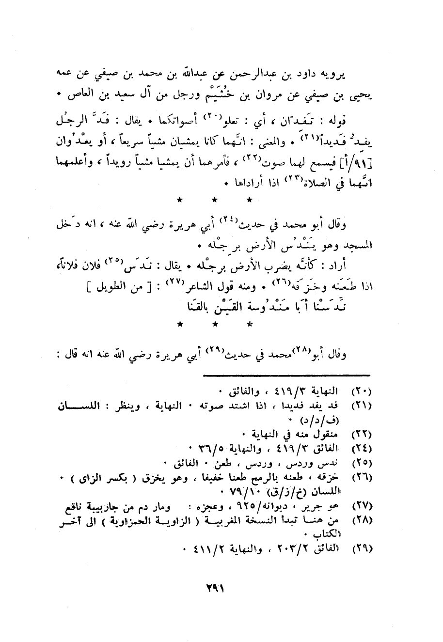 قَوْله: تفدان أَي: تعلو أصواتكما. يُقَال: فد الرجل يفد فديدا. وَالْمعْنَى: انهما كَانَا يمشيان مشيا سَرِيعا أَو يعدوان فَيسمع لَهما صَوت فَأَمرهمَا أَن يمشيا مشيا رويدا وأعلمهما انهما فِي الصَّلَاة اذا أراداها.