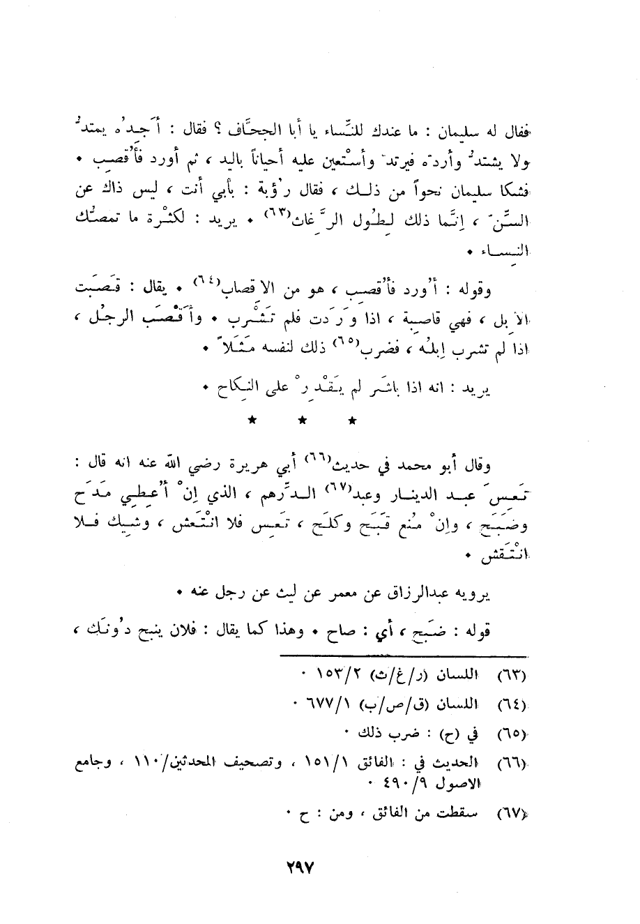 فَقَالَ لَهُ سُلَيْمَان: مَا عنْدك للنِّسَاء يَا أَبَا الجحاف فقا ل: أَجِدهُ يَمْتَد وَلَا يشْتَد وأرده فيرتد وأستعين عَلَيْهِ أَحْيَانًا بِالْيَدِ ثمَّ أورد فأقصب. فَشَكا سُلَيْمَان نَحوا من ذَلِك فَقَالَ رؤبة: بِأبي أَنْت لَيْسَ ذَاك السن انما ذَلِك لطول الرغاث. يُرِيد: لِكَثْرَة مَا تمصك النِّسَاء.