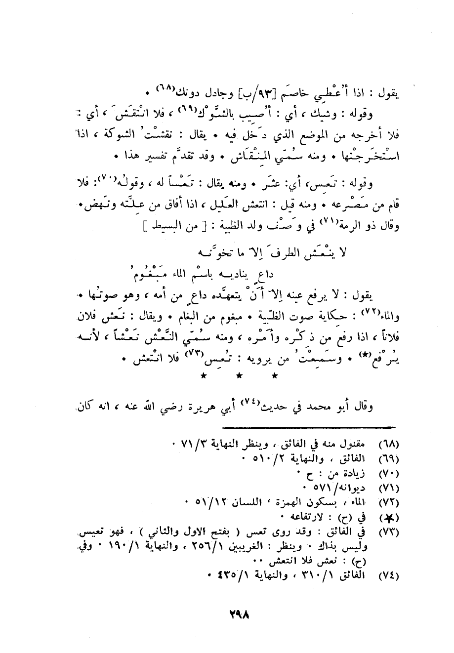 يَقُول: لَا يرفع عينه الا أَن يتعهده دَاع من أمه وَهُوَ صَوتهَا وَالْمَاء: حِكَايَة صَوت الظبية. مبغوم من البغام. وَيُقَال: نعش فلَان فلَانا اذا رفع من ذكره وَأمره وَمِنْه سمي النعش نعشا لِأَنَّهُ يرفع. وَسمعت من يرويهِ: تعس فَلَا انْتَعش.