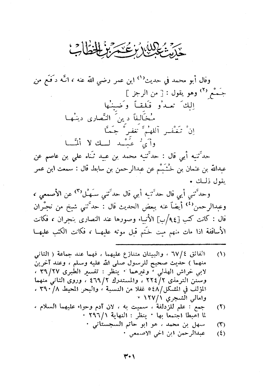 وحَدثني ابي قَالَ حَدثنِي أبي قَالَ حَدثنِي سهل عَن الْأَصْمَعِي وعبد الرحمن أَيْضا عَنهُ بِبَعْض الحَدِيث قَالَ: حَدثنِي شيخ من نَجْرَان قَالَ: كَانَت كتب الْأَنْبِيَاء وصورها عِنْد النَّصَارَى بِنَجْرَان فَكَانَت الأساقفة اذا مَاتَ مِنْهُم ميت ختم قبل مَوته عَلَيْهَا فَكَانَت الْكتب عَلَيْهَا