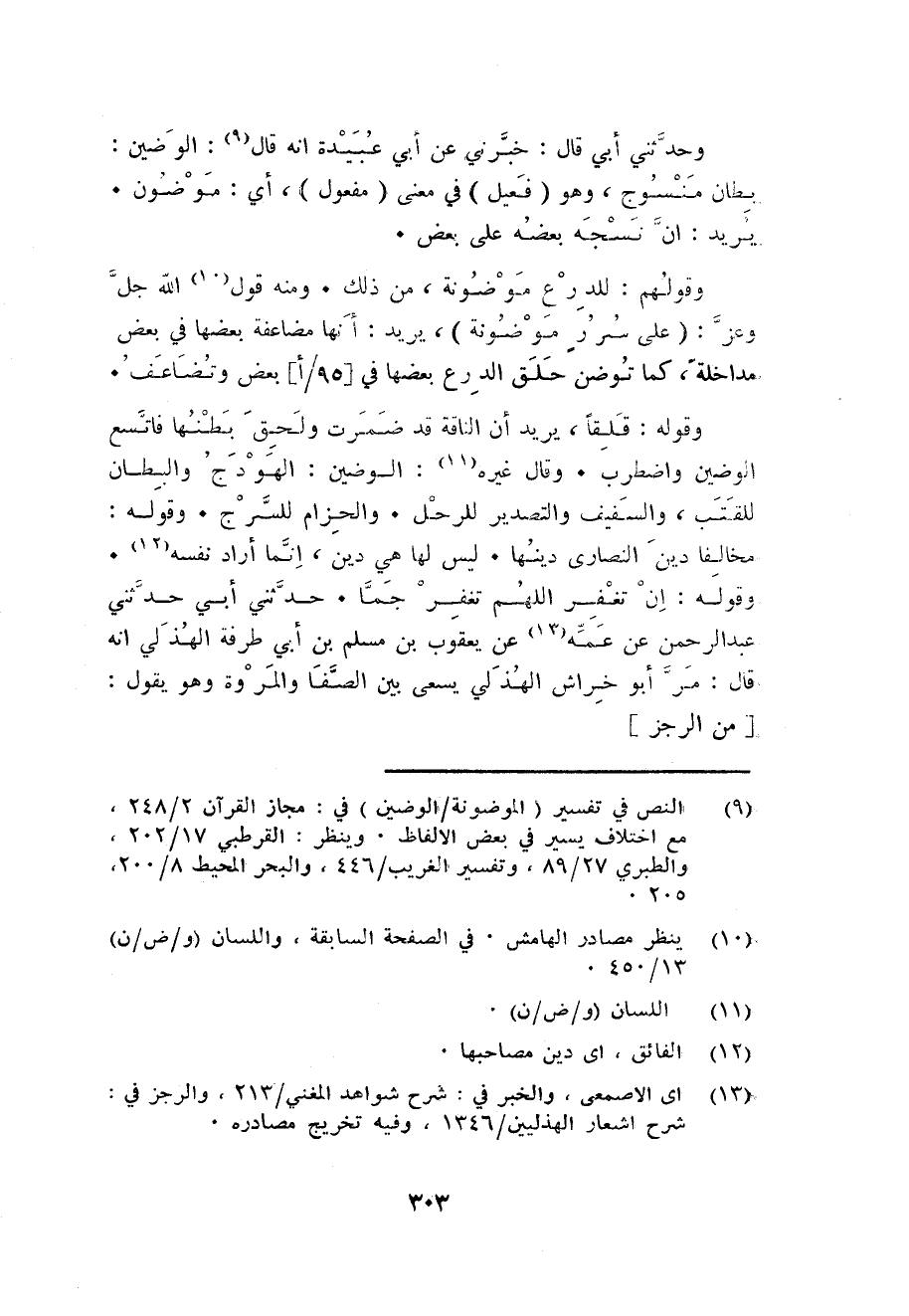 وَقَوله: قلقا يُرِيد أَن النَّاقة قد ضمرت وَلحق بَطنهَا فاتسع الْوَضِين واضطرب. وَقَالَ غَيره: الْوَضِين: الهودج والبطان للقتب والسفيف والتصدير للرحل. والحزام للسرج. وَقَوله: مُخَالفا دين النَّصَارَى دينهَا. لَيْسَ لَهَا هِيَ دين انما أَرَادَ نَفسه. وَقَوله: ان تغْفر اللَّهُمَّ تغْفر جما. حَدثنِي أبي حَدثنِي عبد الرحمن عَن عَمه عَن يَعْقُوب بن مُسلم بن أبي طرفَة الْهُذلِيّ انه قَالَ: مر أَبُو خرَاش الْهُذلِيّ يسْعَى بَين الصَّفَا والمروة وَهُوَ يَقُول: من الرجز