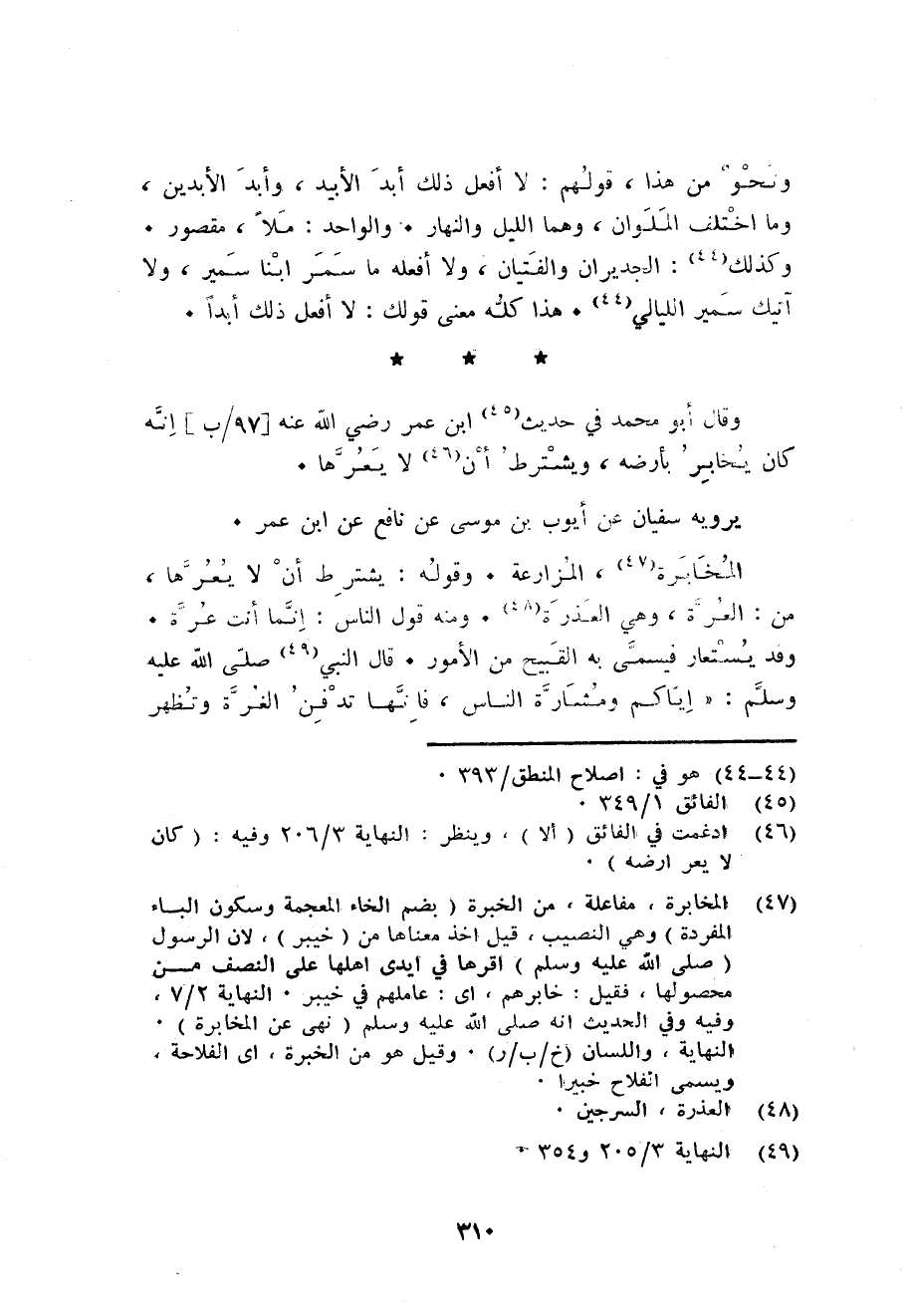 وَقَالَ أَبُو مُحَمَّد فِي حَدِيث ابْن عمر رَضِي الله عَنهُ انه كَانَ يخابر بأرضه وَيشْتَرط أَن لَا يعرها.
