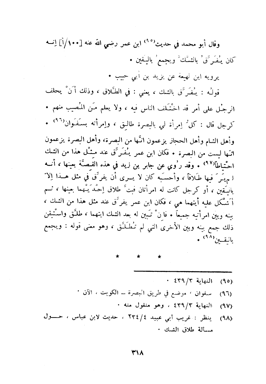 وَأهل الشَّام وَأهل الْحجاز يَزْعمُونَ انها من الْبَصْرَة وَأهل الْبَصْرَة يَزْعمُونَ انها لَيست من الْبَصْرَة. فَكَانَ ابْن عمر يفرق عِنْد مثل هَذَا من الشَّك احْتِيَاطًا. وَقد رُوِيَ عَن جَابر بن زيد فِي هَذِه الْقِصَّة بِعَينهَا أَنه لم ير فِيهَا طَلَاقا وَأَحْسبهُ كَانَ لَا يرى أَن يفرق فِي مثل هَذَا الا بِالْيَقِينِ أَو كَرجل كَانَت لَهُ امْرَأَتَانِ فَبت طَلَاق احديهما بِعَينهَا ثمَّ أشكل عَلَيْهِ أَيَّتهمَا هِيَ فَكَانَ ابْن عمر يفرق عِنْد مثل هَذَا من الشَّك بَينه وَبَين امرأتيه جَمِيعًا. فان تبين لَهُ بعد الشَّك ايتهما طلق واستيقن ذَلِك جمع بَينه وَبَين الْأُخْرَى الَّتِي لم تطلق وَهُوَ معنى قَوْله: وَيجمع بِالْيَقِينِ.