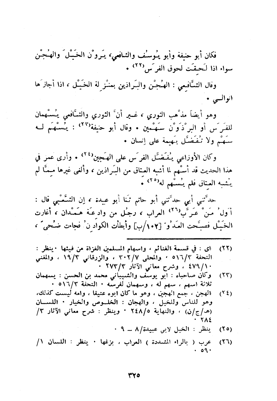 فَكَانَ أَبُو حنيفَة وَأَبُو يُوسُف وَالشَّافِعِيّ يرَوْنَ الْخَيل والهجن سَوَاء اذا لحقت لُحُوق الْفرس.
