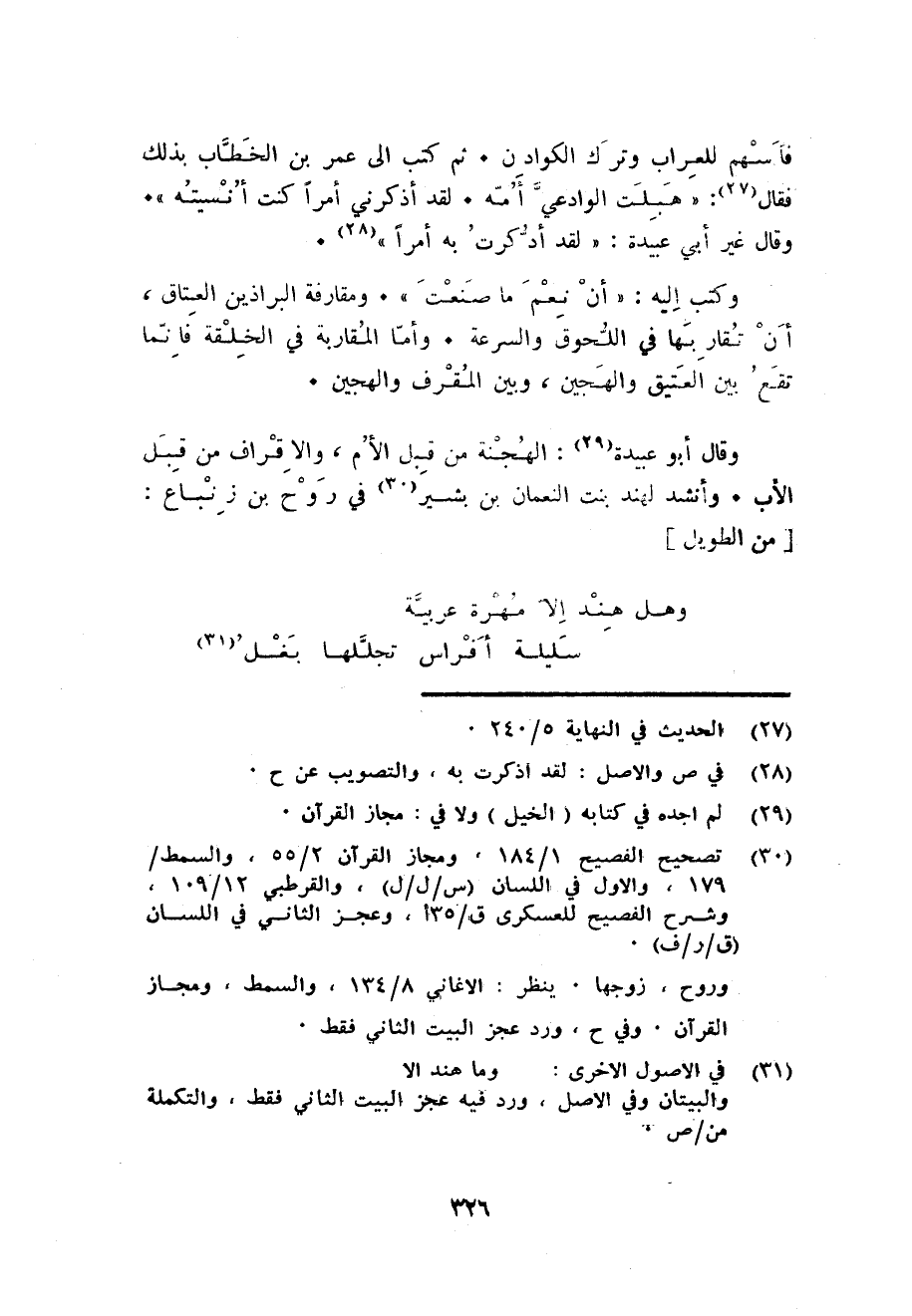 وَقَالَ أَبُو عُبَيْدَة: الهجنة من قبل الْأُم والاقراف من قبل الاب. وَأنْشد لهِنْد بنت النُّعْمَان بن بشير فِي روح بن زنباع: من الطَّوِيل ... وَهل هِنْد الا مهرَة عَرَبِيَّة ... سليلة أَفْرَاس تجللها بغل ...