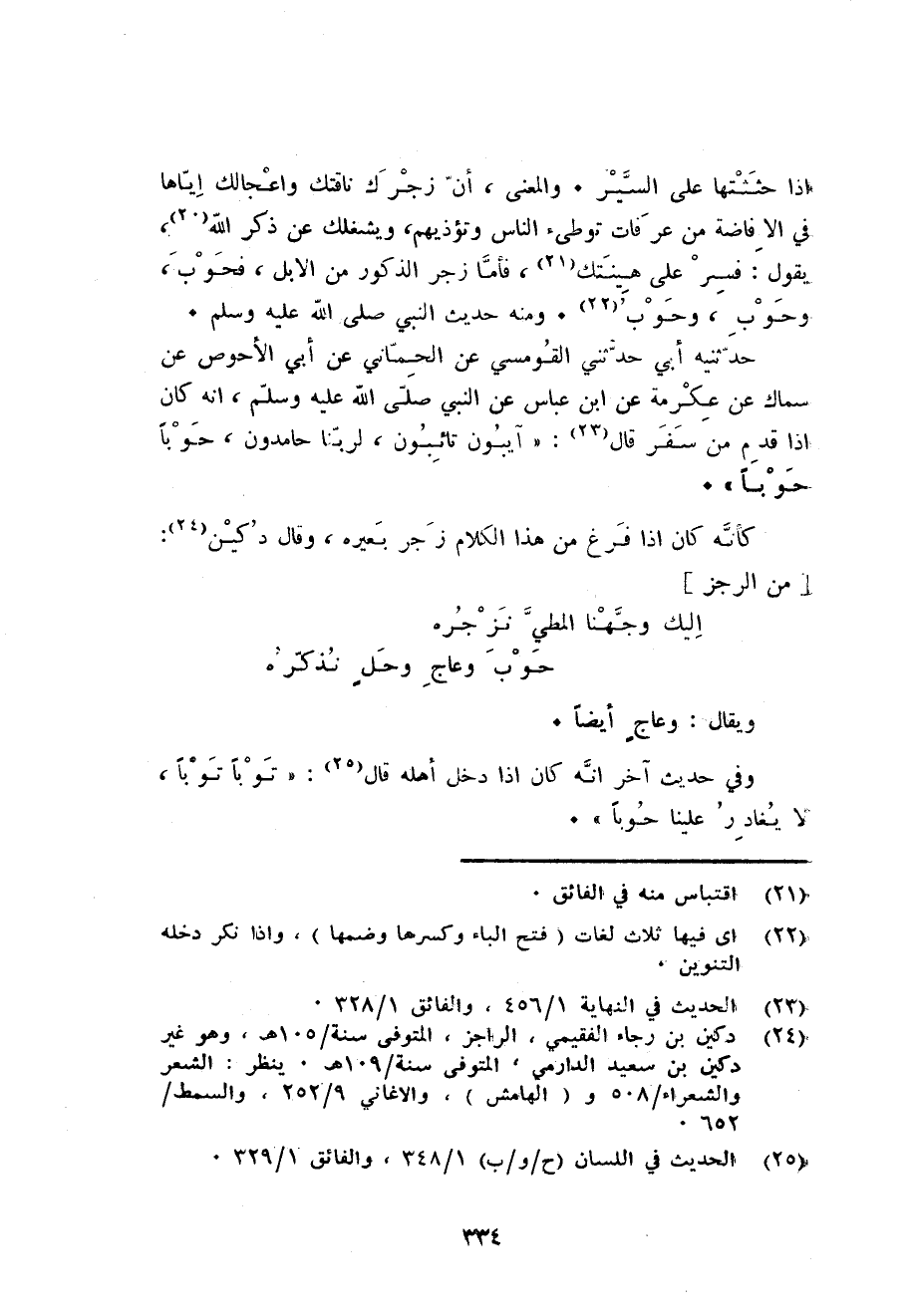 اذا حثثتها على السّير. وَالْمعْنَى أَن زجرك نَاقَتك واعجالك اياها فِي الافاضة من عَرَفَات توطىء النَّاس وتؤذيهم ويشغلك عَن ذكر الله يوقل: فسر على هينتك فَأَما زجر الذُّكُور من الأبل فحوب وحوب وحوب. وَمِنْه حَدِيث النبى صلى الله عَلَيْهِ وَسلم حَدَّثَنِيهِ أبي حَدثنِي القومسي عَن الْحمانِي عَن أبي الْأَحْوَص عَن سماك عَن عِكْرِمَة عَن ابْن عَبَّاس عَن النبى صلى الله عَلَيْهِ وَسلم انه كَانَ اذا قدم من سفر قَالَ: آيبون تائبون لربنا حامدون حوبا حوبا.