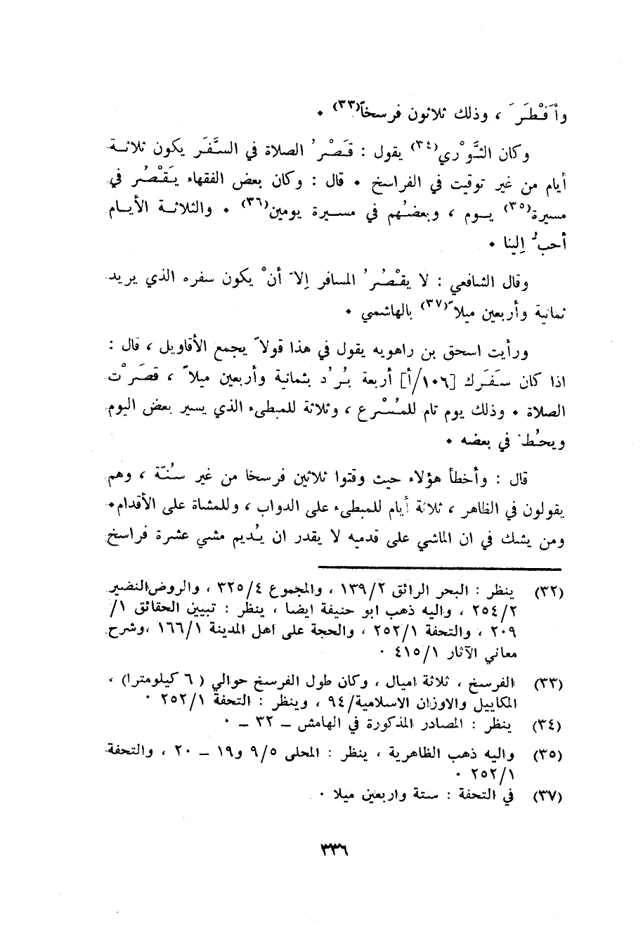 قَالَ: وَأَخْطَأ هَؤُلَاءِ حَيْثُ وقتوا ثَلَاثِينَ فرسخا من غير سنة وَهُوَ يَقُولُونَ فِي الظَّاهِر ثَلَاثَة أَيَّام للمبطىء على الدَّوَابّ وللمشاة على الْأَقْدَام. وَمن يشك فِي ان الْمَاشِي على قَدَمَيْهِ لَا يقدر أَن يديم مشي عشرَة فراسخ
