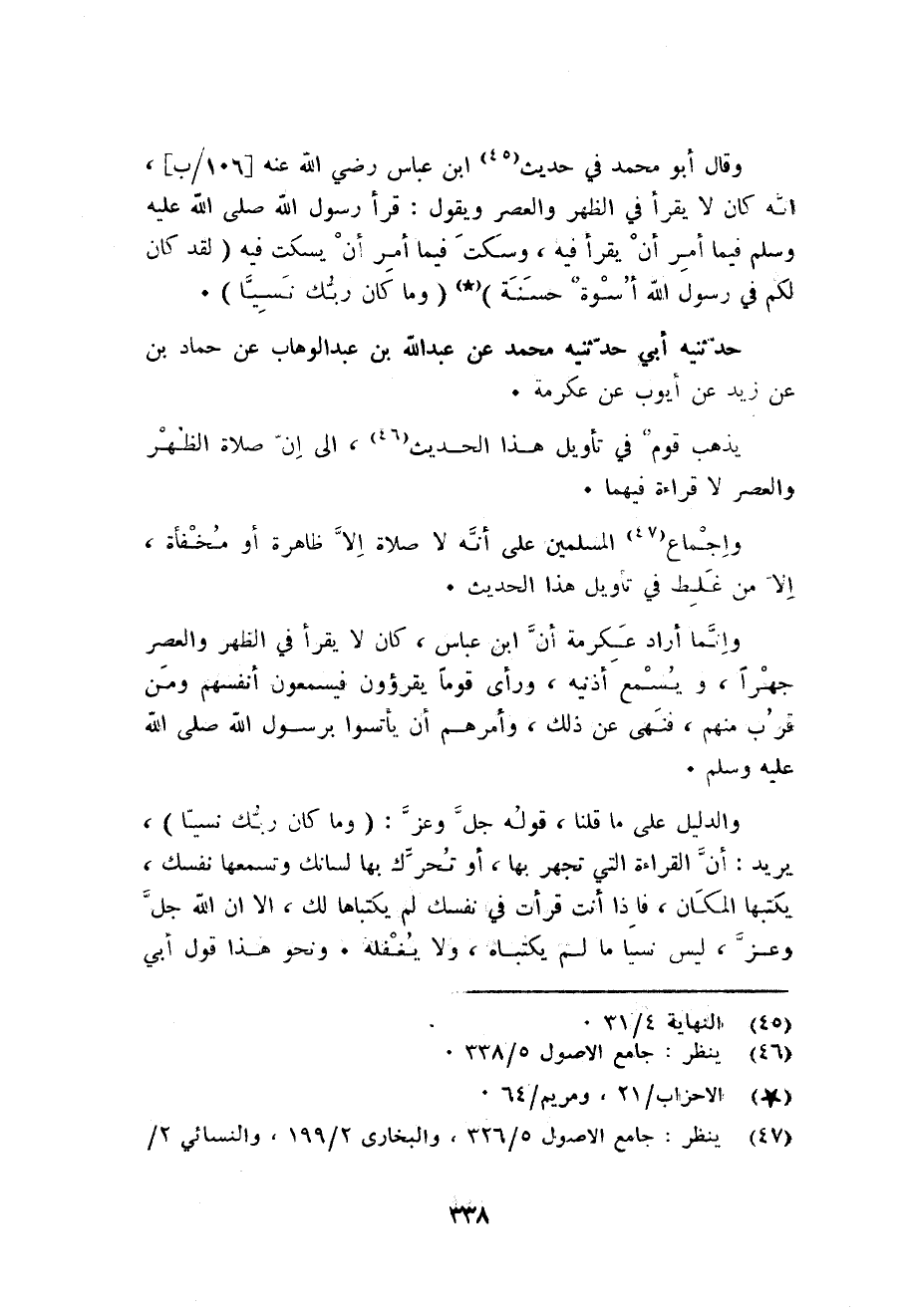 وَقَالَ أَبُو مُحَمَّد فِي حَدِيث ابْن عَبَّاس رَضِي الله عَنهُ انه كَانَ لَا يقْرَأ فِي الظّهْر وَالْعصر وَيَقُول: قَرَأَ رَسُول الله صلى الله عَلَيْهِ وَسلم فِيمَا أَمر أَن يقْرَأ فِيهِ وَسكت فِيمَا أَمر أَن يسكت فِيهِ لقد كَانَ لكم فِي رَسُول الله أُسْوَة حَسَنَة وَمَا كَانَ رَبك نسيا.
