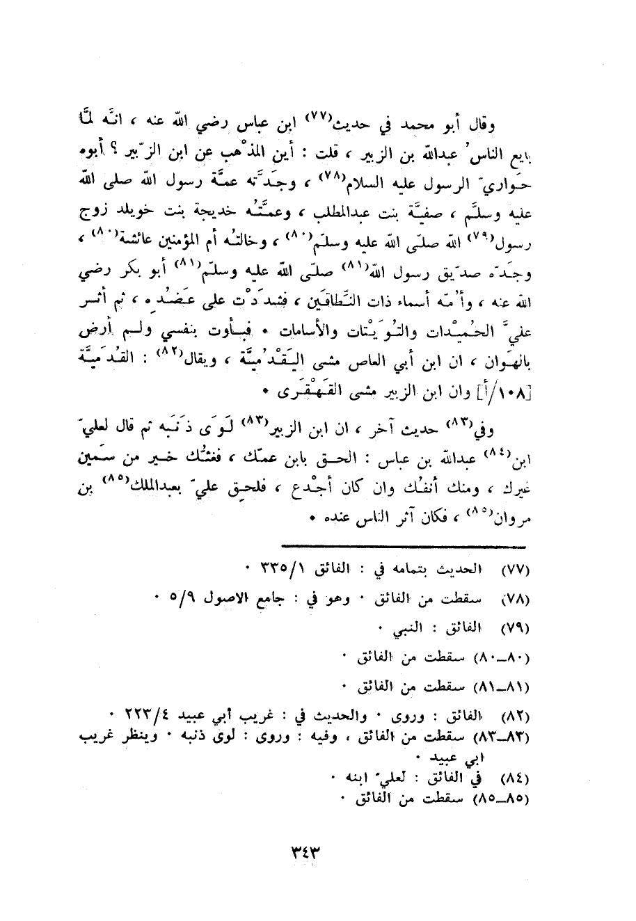 وَقَالَ أَبُو مُحَمَّد فِي حَدِيث ابْن عَبَّاس رَضِي الله عَنهُ انه لما بَايع النَّاس عبد الله بن الزبير قلت: أَيْن الْمَذْهَب عَن ابْن الزبير أَبوهُ حوارِي الرَّسُول عَلَيْهِ السَّلَام وجدته عمَّة رَسُول الله صلى الله عَلَيْهِ وَسلم صَفِيَّة بنت عبد المطلب وَعَمَّته خَدِيجَة بنت خويلد زوج رَسُول الله صلى الله عَلَيْهِ وَسلم وخالته أم الْمُؤمنِينَ عَائِشَة وجده صديق رَسُول الله صلى الله عَلَيْهِ وَسلم أَبُو بكر رَضِي الله عَنهُ وَأمه أَسمَاء ذَات النطاقين فشددت على عضده ثمَّ أثر عَليّ الحميدات والتويتات والأسامات. فبأوت بِنَفس وَلم أَرض بالهوان ان ابْن أبي الْعَاصِ مَشى اليقدمية وَيُقَال: القدمية وان ابْن الزبير مَشى الْقَهْقَرَى.
