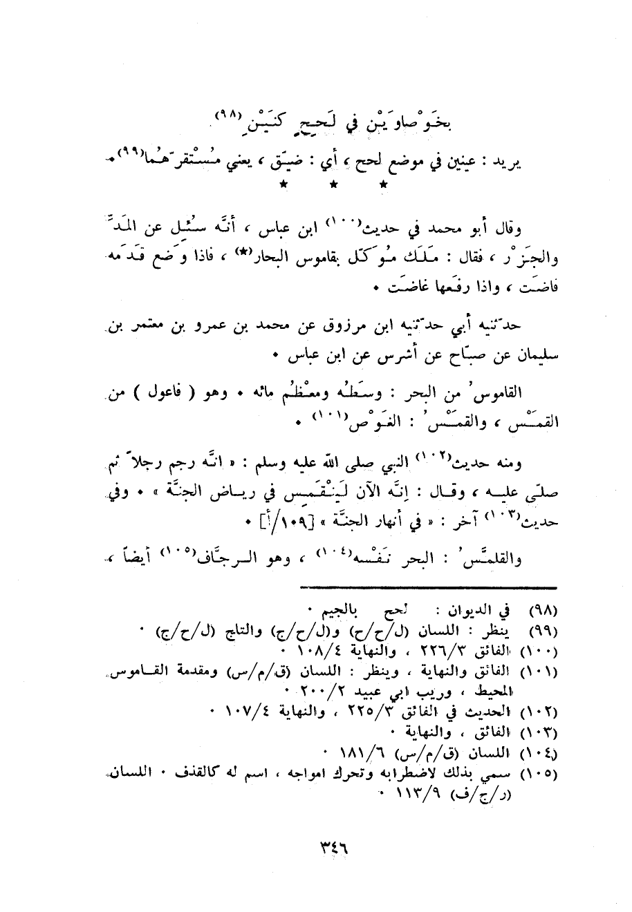 وَقَالَ أَبُو مُحَمَّد فِي حَدِيث ابْن عَبَّاس أَنه سُئِلَ عَن الْمَدّ والجزر فَقَالَ: ملك مُوكل بقاموس الْبحار فاذا وضع قدمه فاضت واذا رَفعهَا غاضت.